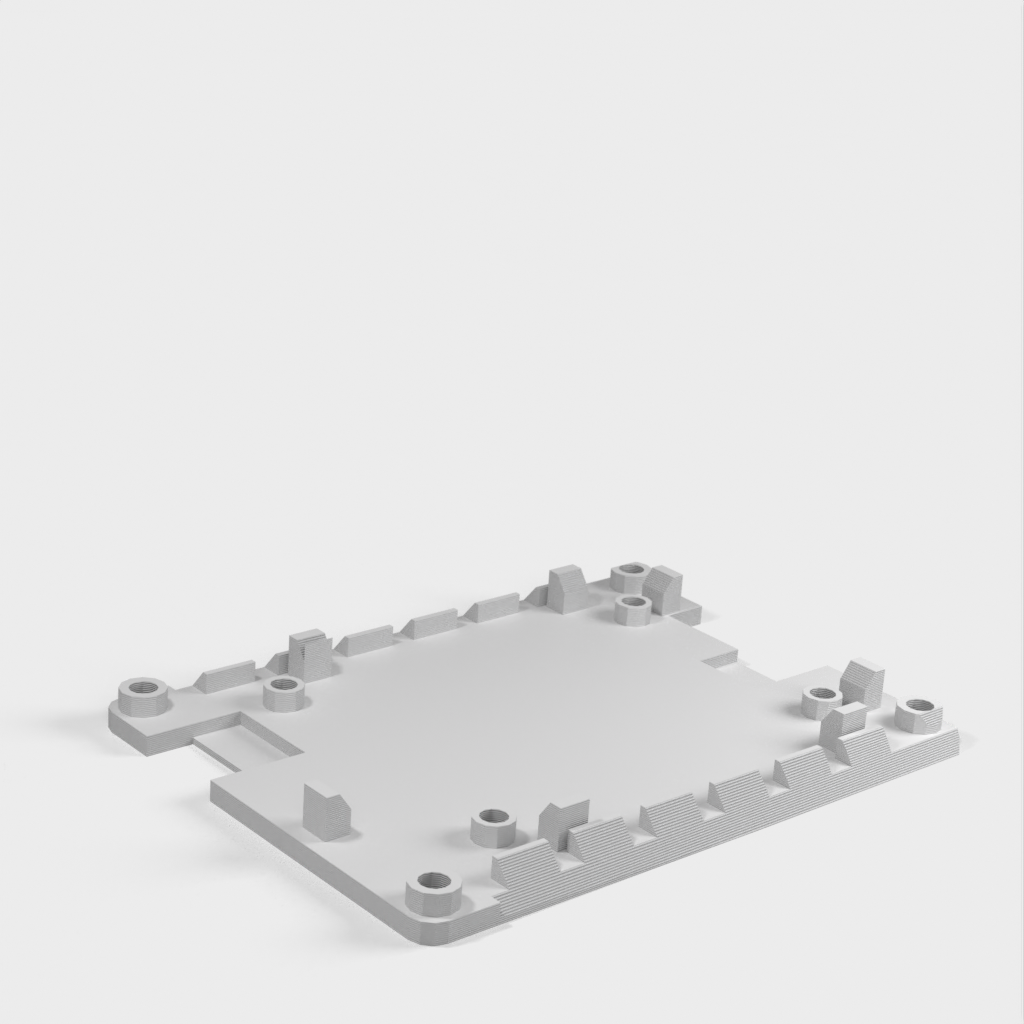 Uchwyt można zamontować na laptopie ClamShelf. Ma ścięte krawędzie, które wsuwają się w półkę ClamShelf. Otwory wentylacyjne na ściętych krawędziach umożliwiają cyrkulację powietrza pod płytką drukowaną zarówno poziomo, jak i pionowo przez otwartą górę i dół. Prowadnice pozycjonujące pomagają umieścić płytkę PCB, a otwory na śruby w rogach umożliwiają układanie wielu uchwytów za pomocą śrub #4-40, podkładek dystansowych i nakrętek.