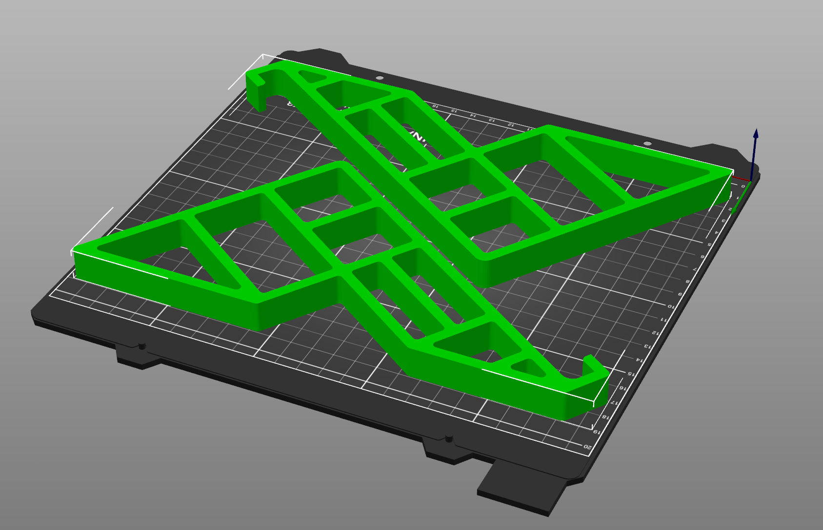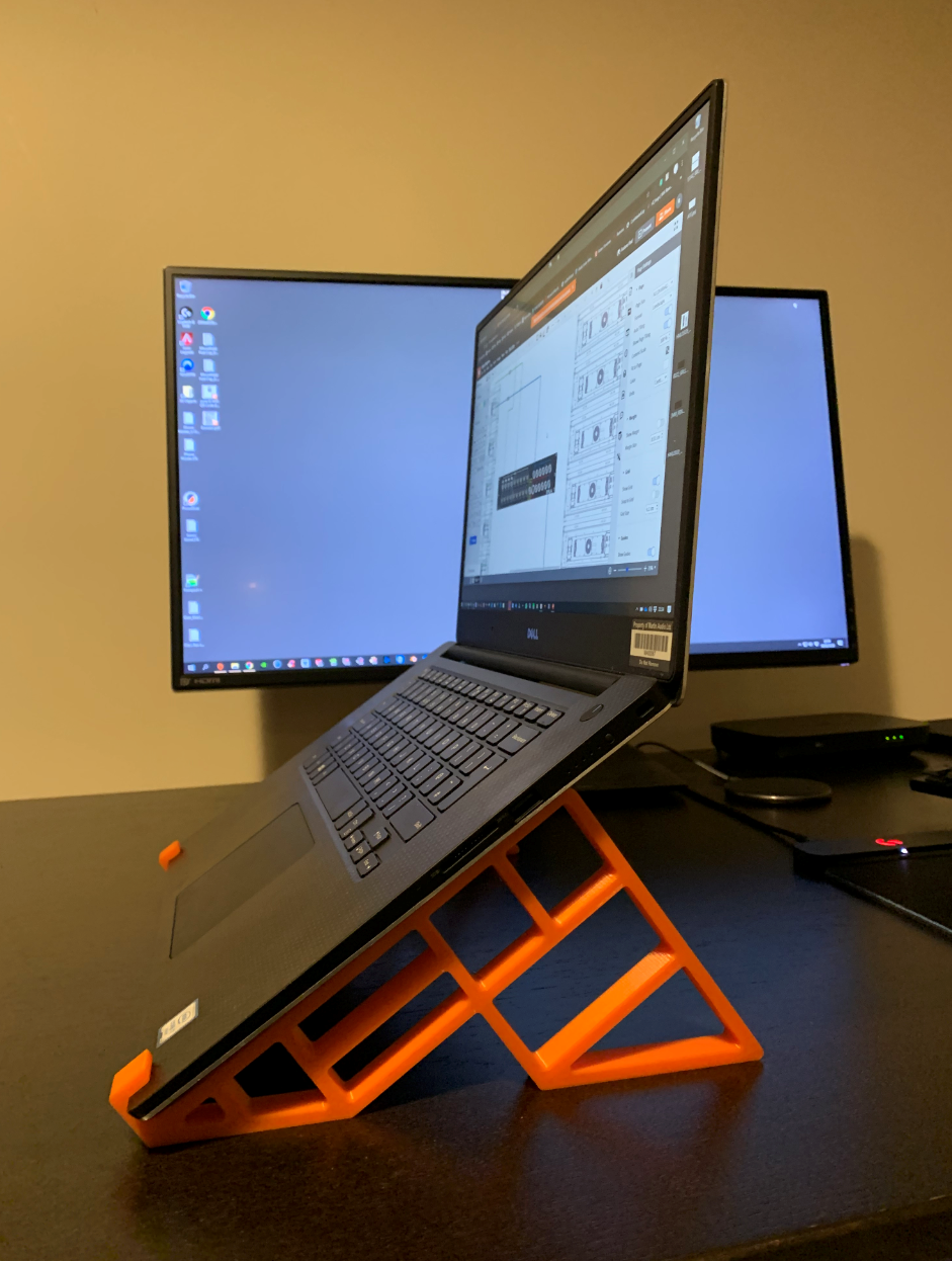 Podstawka pod laptopa Dell XPS 15. Podnosi ekran do około 170 mm i ustawia go pod idealnym kątem, aby uzyskać płaską pozycję ekranu po pełnym zawieszeniu. Podstawka idealnie pasuje do łoża MK3 i jest drukowana przy użyciu SUNLU PETG. Wydruk zajmuje około 9 godzin i wykorzystuje 3 obwody z kątem wypełnienia 55 stopni i wypełnieniem Gyroid na poziomie 15%.