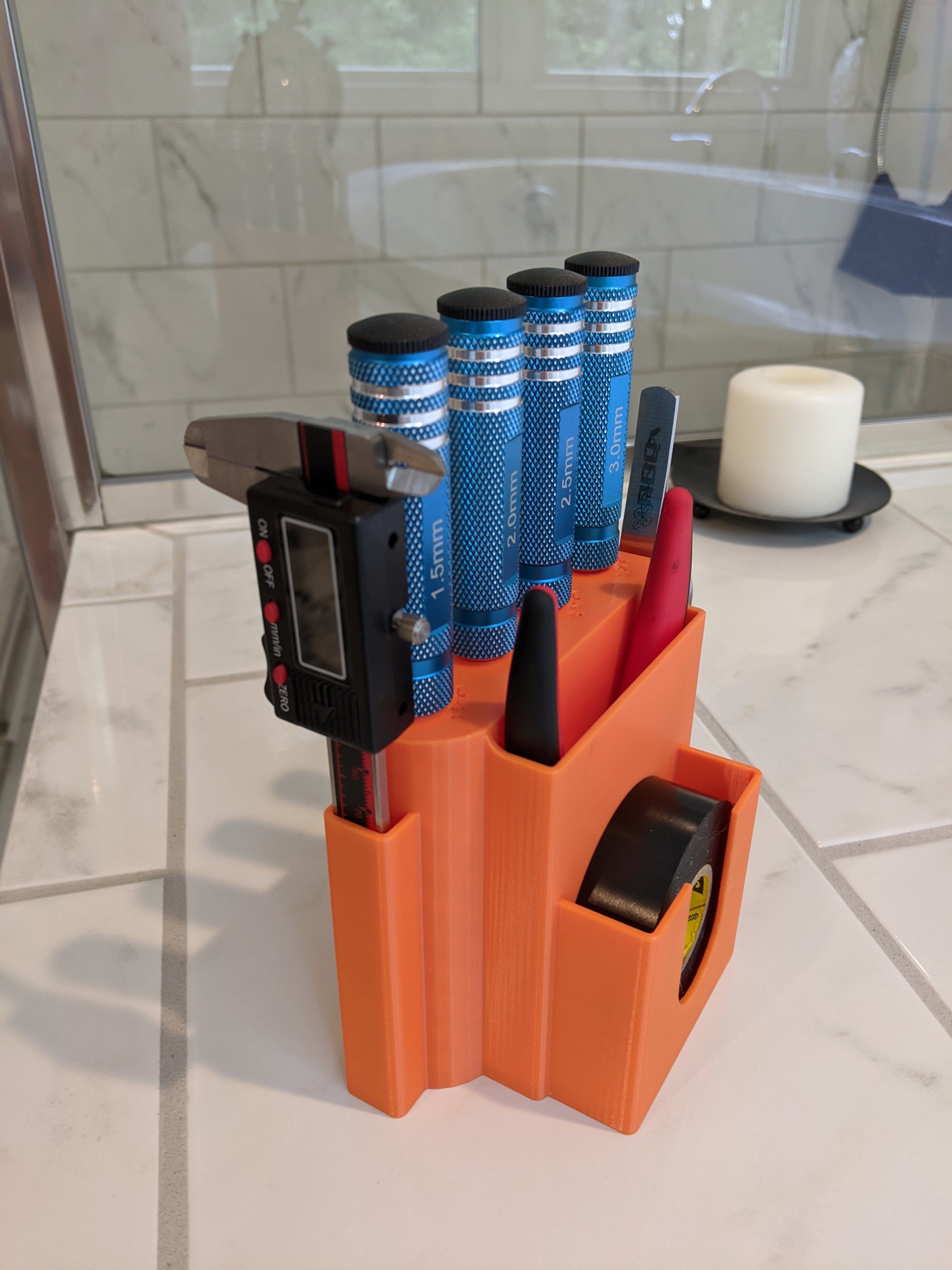 Poręczny organizer biurkowy zaprojektowany do przechowywania wszystkich codziennych narzędzi do budowy i naprawy dronów FPV i druku 3D. Organizer ten znacznie skraca czas budowy i naprawy dzięki przechowywaniu najpotrzebniejszych narzędzi pod ręką. Wykonany jest z pomarańczowego Hatchbox PLA, aby zapewnić trwałość i spójność.
