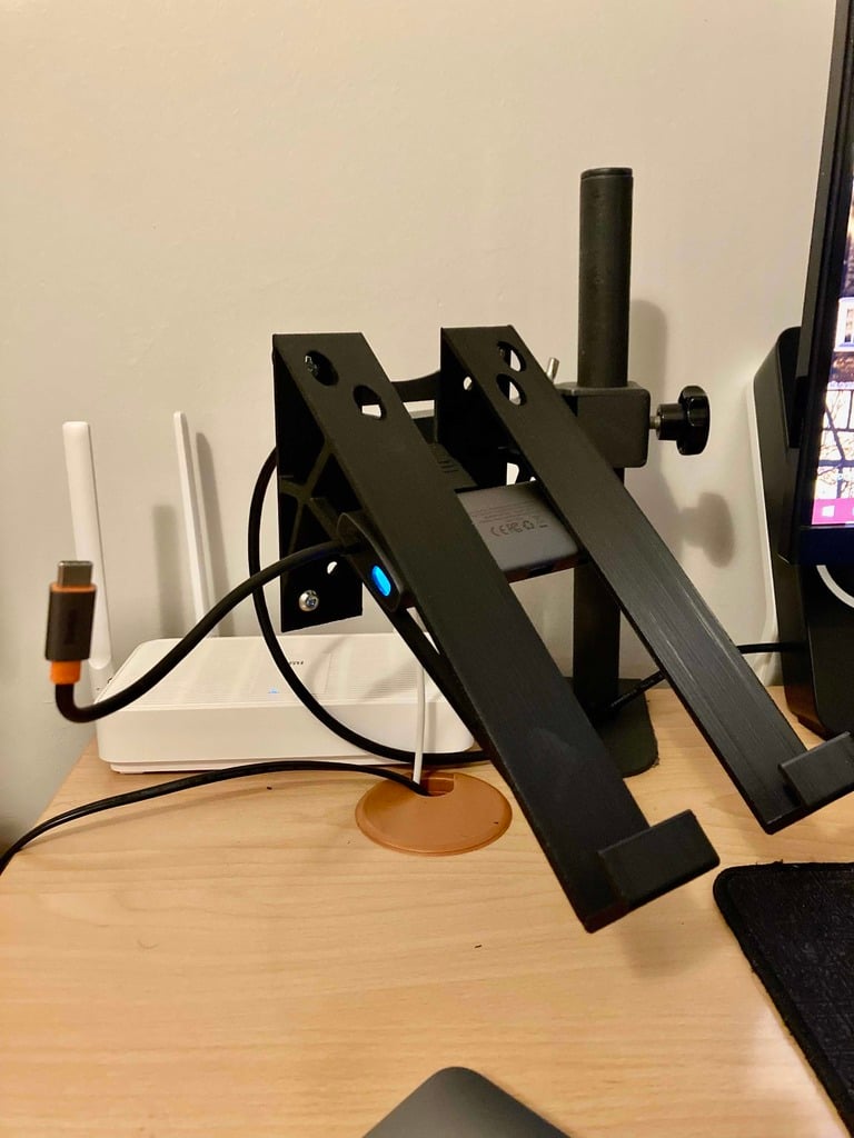 To jest ekonomiczny stojak/uchwyt na laptopa VESA, przeznaczony do montażu na pionowych statywach VESA. Model składa się z dwóch połówek, co zapewnia ekonomiczną i oszczędzającą czas produkcję. Z łatwością obsługuje MacBooka Air 2020, ale jest kompatybilny z większością laptopów ze statywem VESA. Do montażu tego stojaka zaleca się użycie 4 śrub i nakrętek M4.
