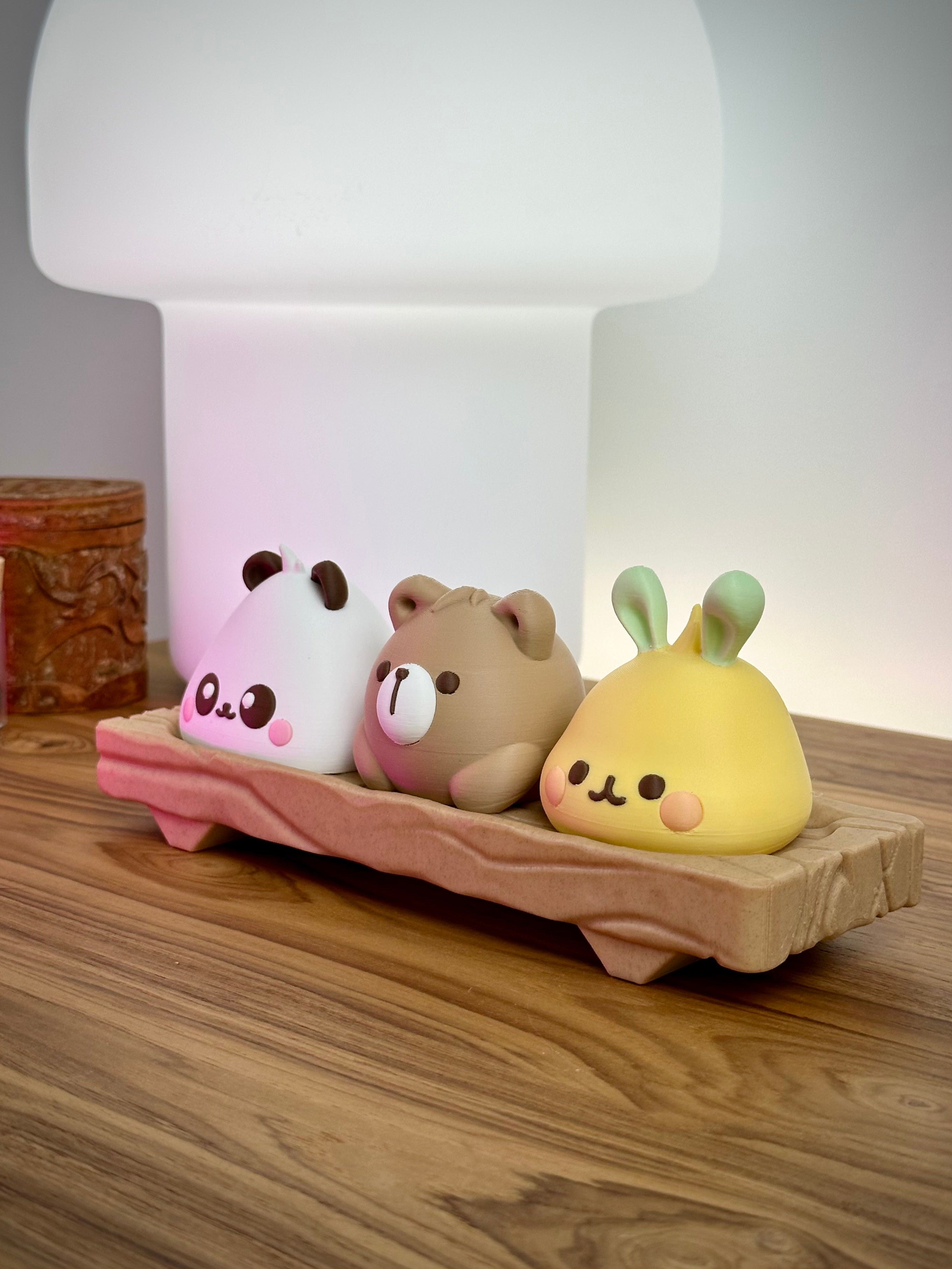 - Uroczy zestaw składający się z trzech uroczych figurek zwierzątek bao: królika, pandy i niedźwiadka.