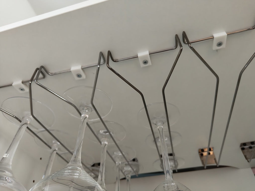 Jest to mały wspornik do montażu uchwytów na szkło IKEA Besta (304.119.53) na dowolnej półce – w naszym przypadku szafki kuchennej IKEA Metod. Stosowana śruba to Spax 3,5x20.