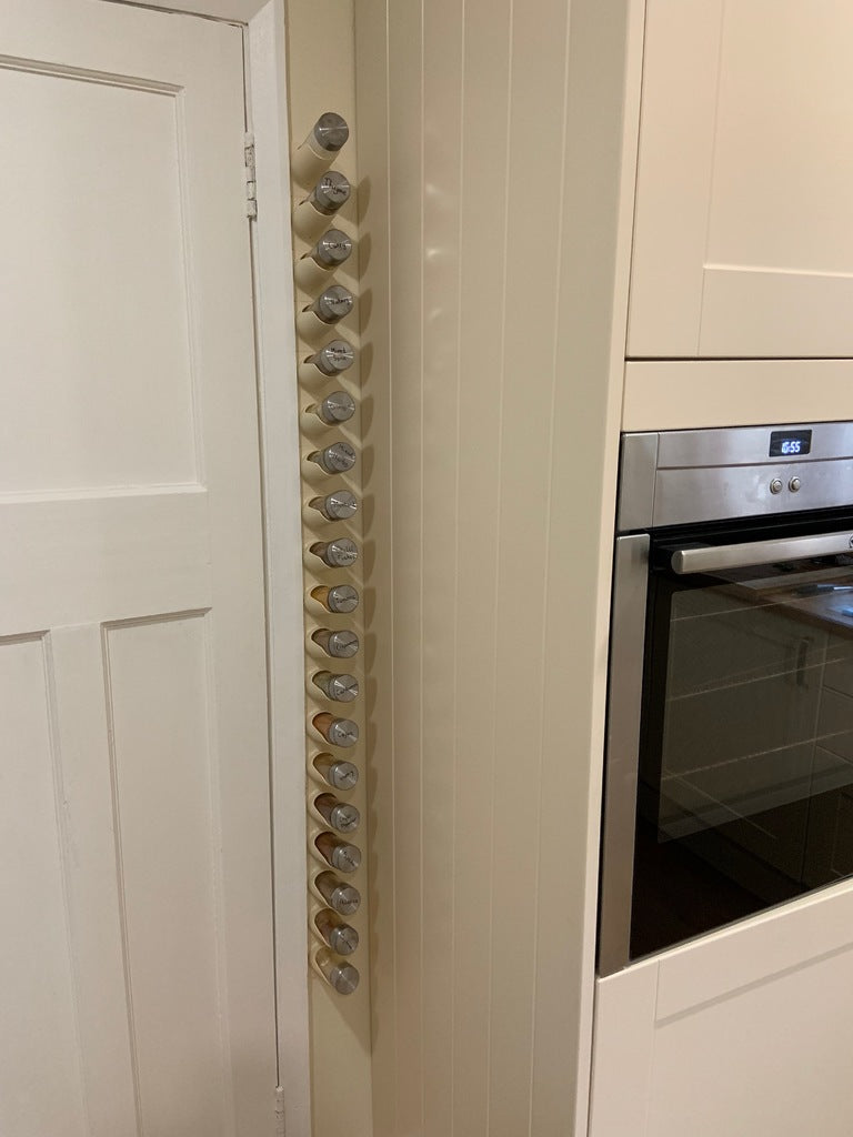 Uchwyt można przymocować do ściany za pomocą otworu na śrubę na dole, ale można go również łatwo zamontować za pomocą kleju takiego jak 'No Nails'. Specjalny design umożliwia łatwe wkładanie i wyjmowanie słoików, dzięki czemu szybko możesz uzyskać dostęp do swoich ulubionych przypraw. Dodatkowe otwarcie w uchwycie zapewnia ujście powietrza podczas wkładania słoików, co ułatwia użytkowanie i konserwację.