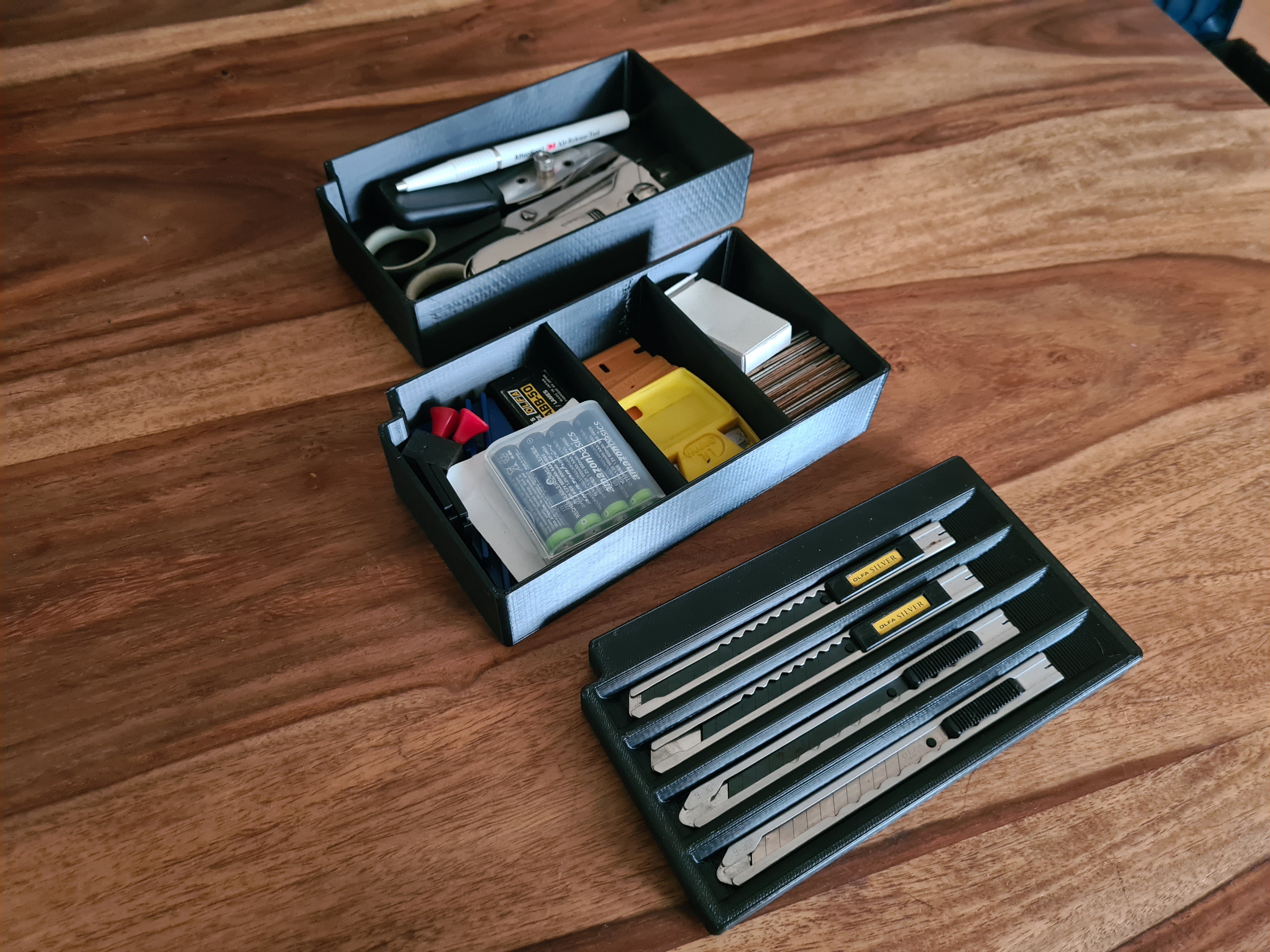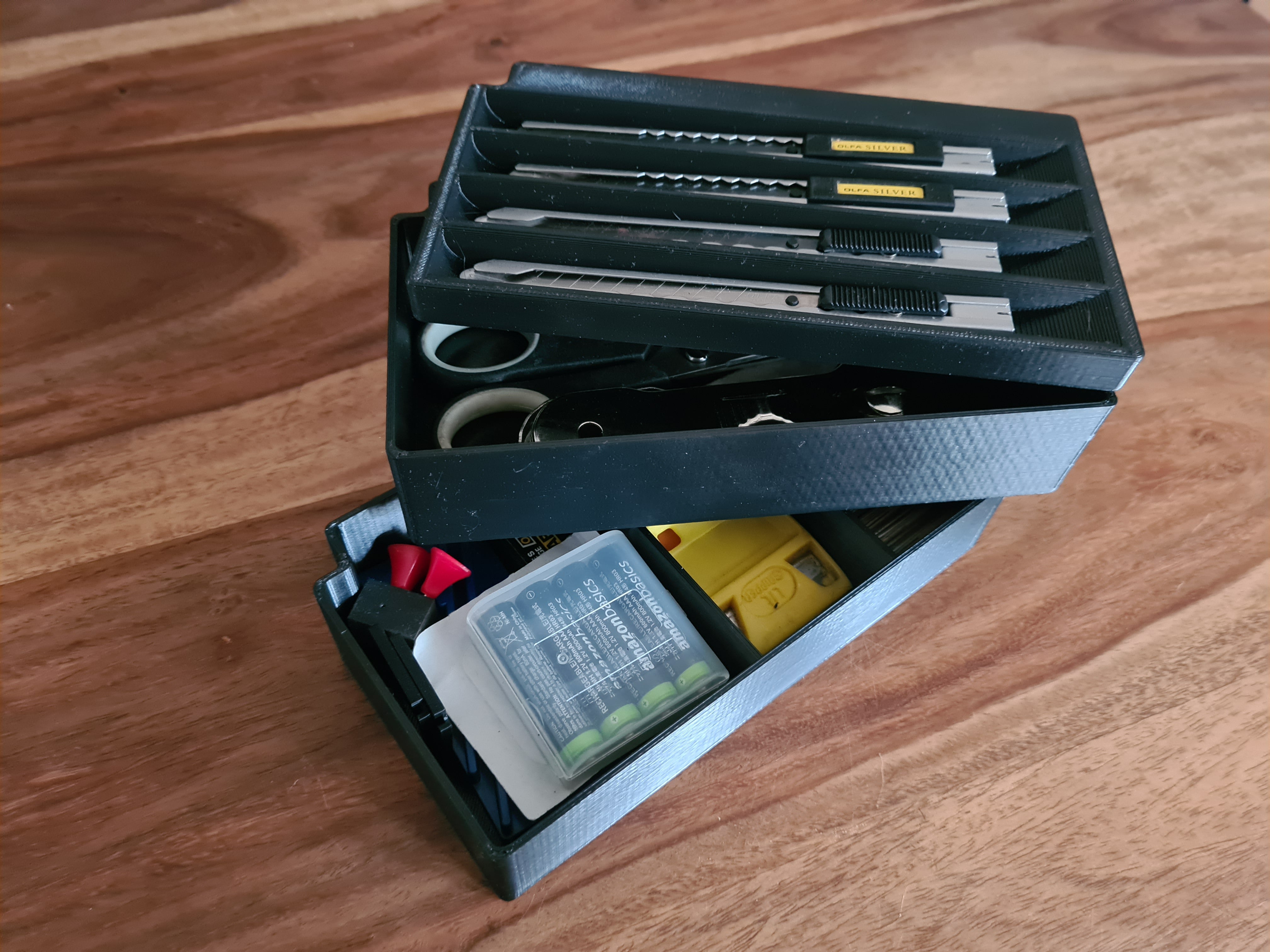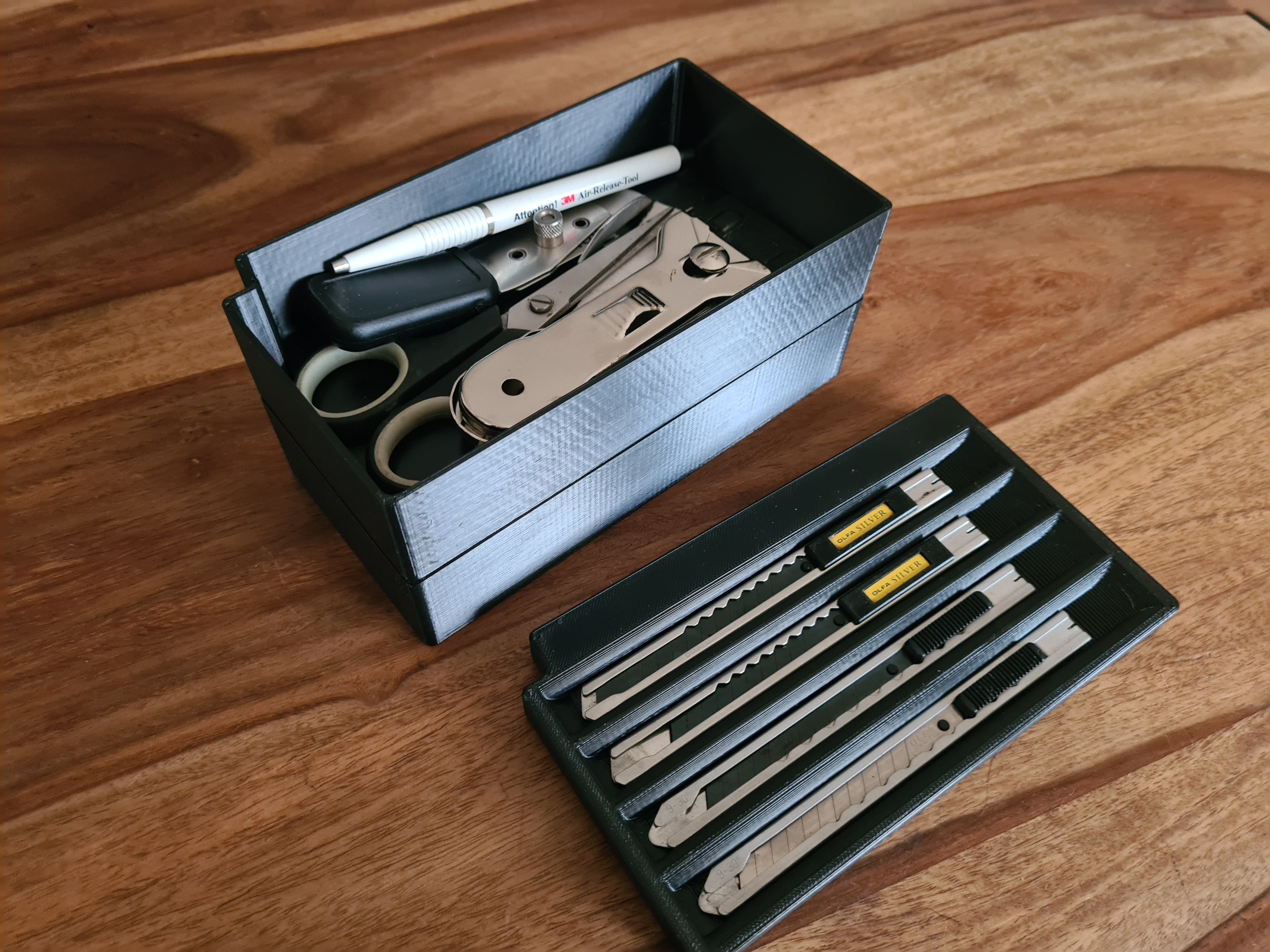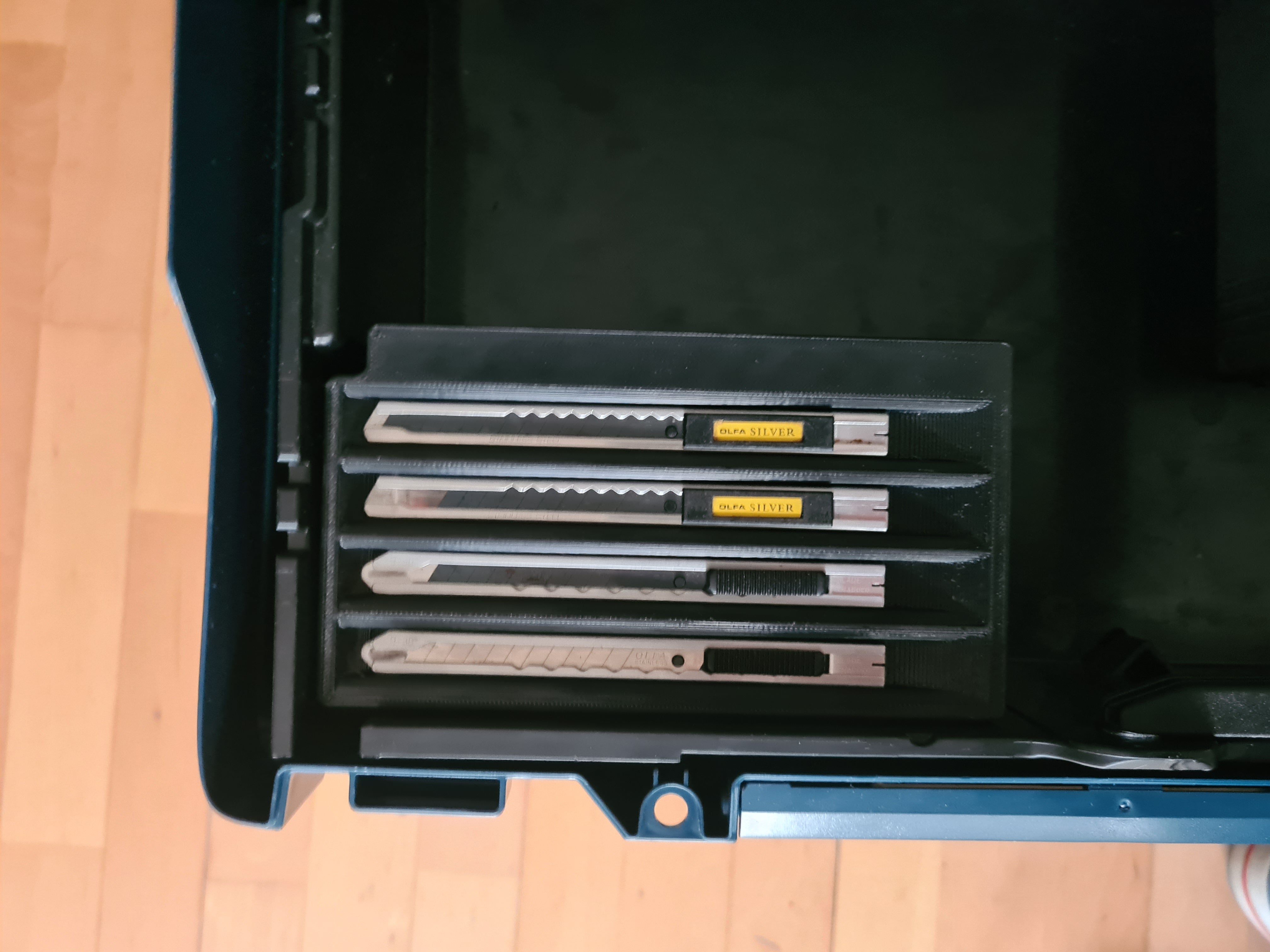 Pojemnik jest podzielony na praktyczne przegródki, z których jedna jest przeznaczona na nóż do cięcia, co zapewnia szybki i bezpieczny dostęp. Ponadto zawiera dwie dodatkowe przegródki do przechowywania, które idealnie nadają się do organizowania zapasowych ostrzy, żyletek, małych baterii lub innych podobnych materiałów eksploatacyjnych. Dolne modułowe pojemniki mogą pomieścić dodatkowe narzędzia specjalistyczne, co przyczynia się do uporządkowanej i wydajnej przestrzeni roboczej.