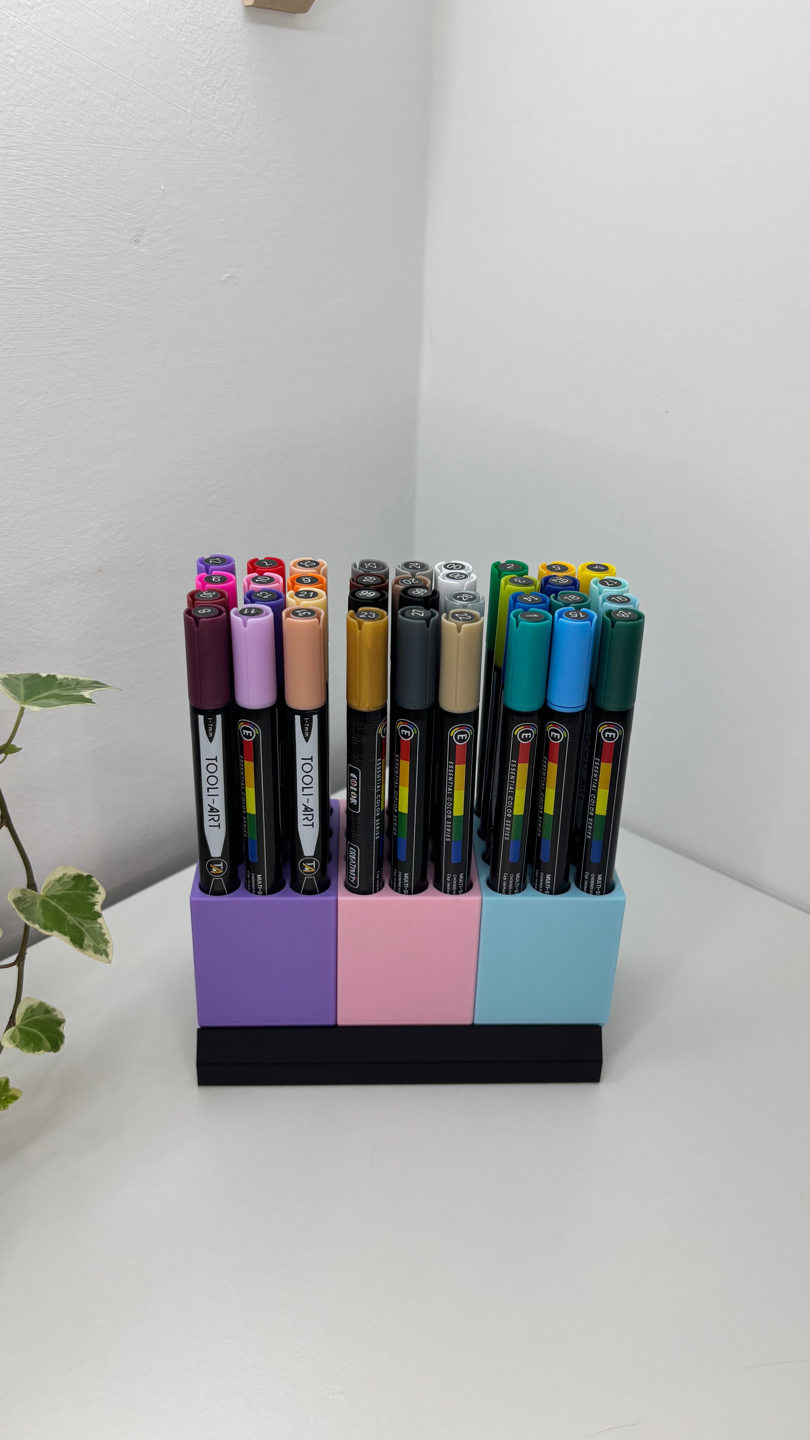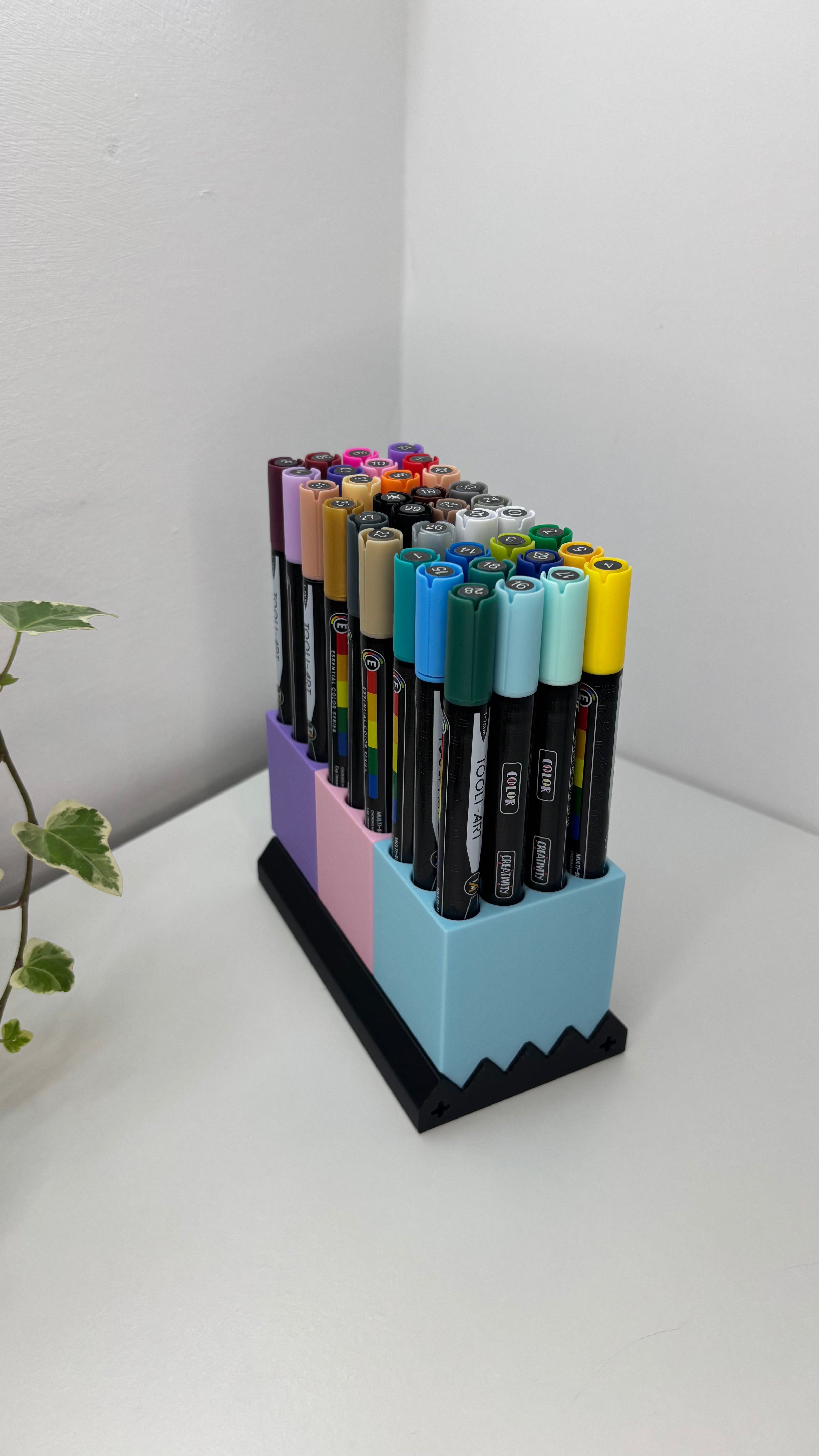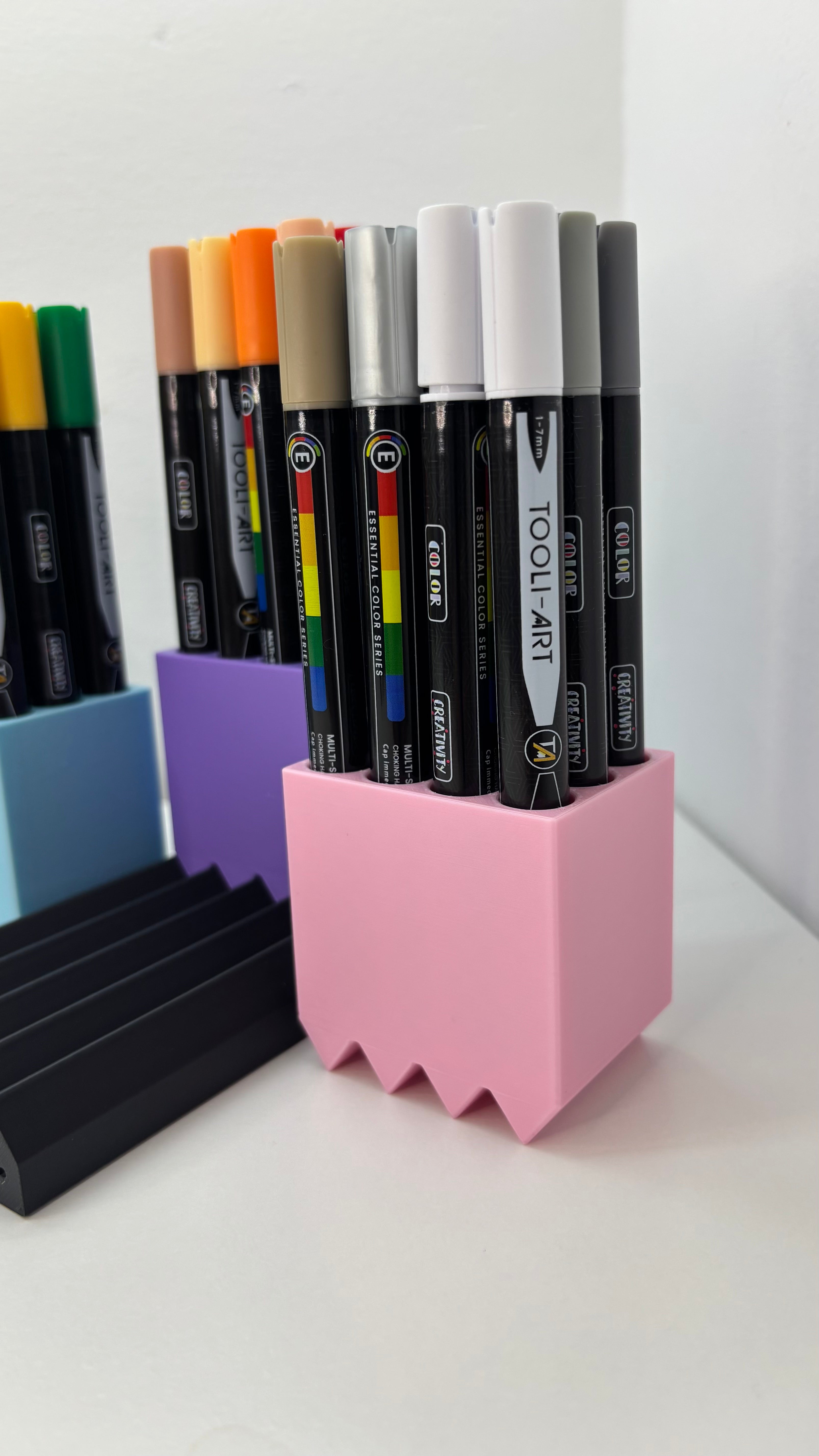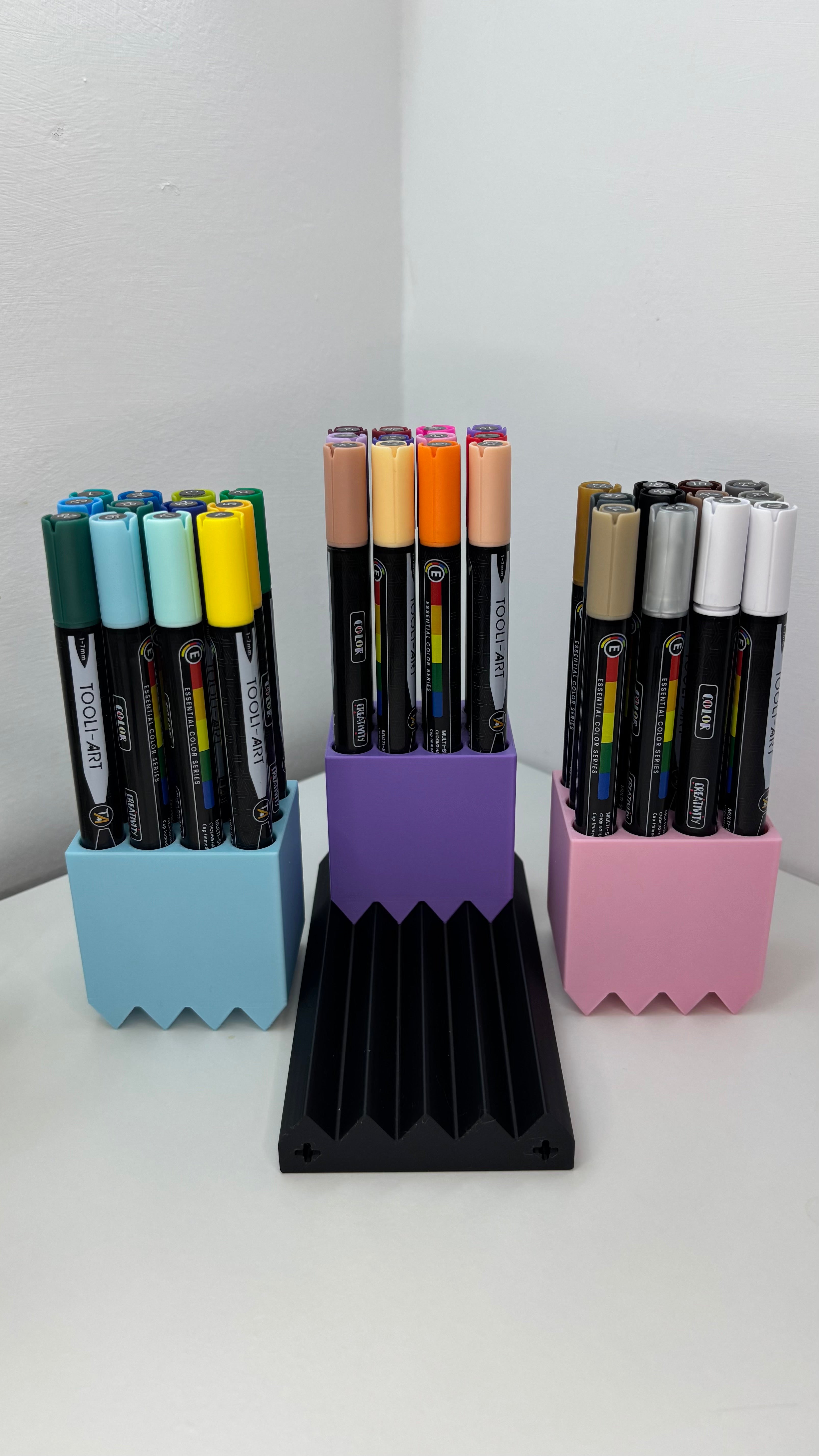 Każdy uchwyt na długopisy zapewnia miejsce na 12 długopisów lub markerów, a podstawa może pomieścić do trzech uchwytów, co zapewnia kompleksowe rozwiązanie do przechowywania długopisów dla 36 artykułów piśmienniczych. Konfigurowalny uchwyt na długopisy i skalowalna konstrukcja sprawiają, że jest to wszechstronny organizer biurowy i niezbędne akcesorium biurowe do każdego biura domowego, pracowni artystycznej lub środowiska twórczego. Pełni funkcję nowoczesnego organizera na biurko, który przyczynia się do uporządkowanej i funkcjonalnej przestrzeni roboczej, idealnej dla artystów, studentów i profesjonalistów poszukujących modułowego rozwiązania do przechowywania.
