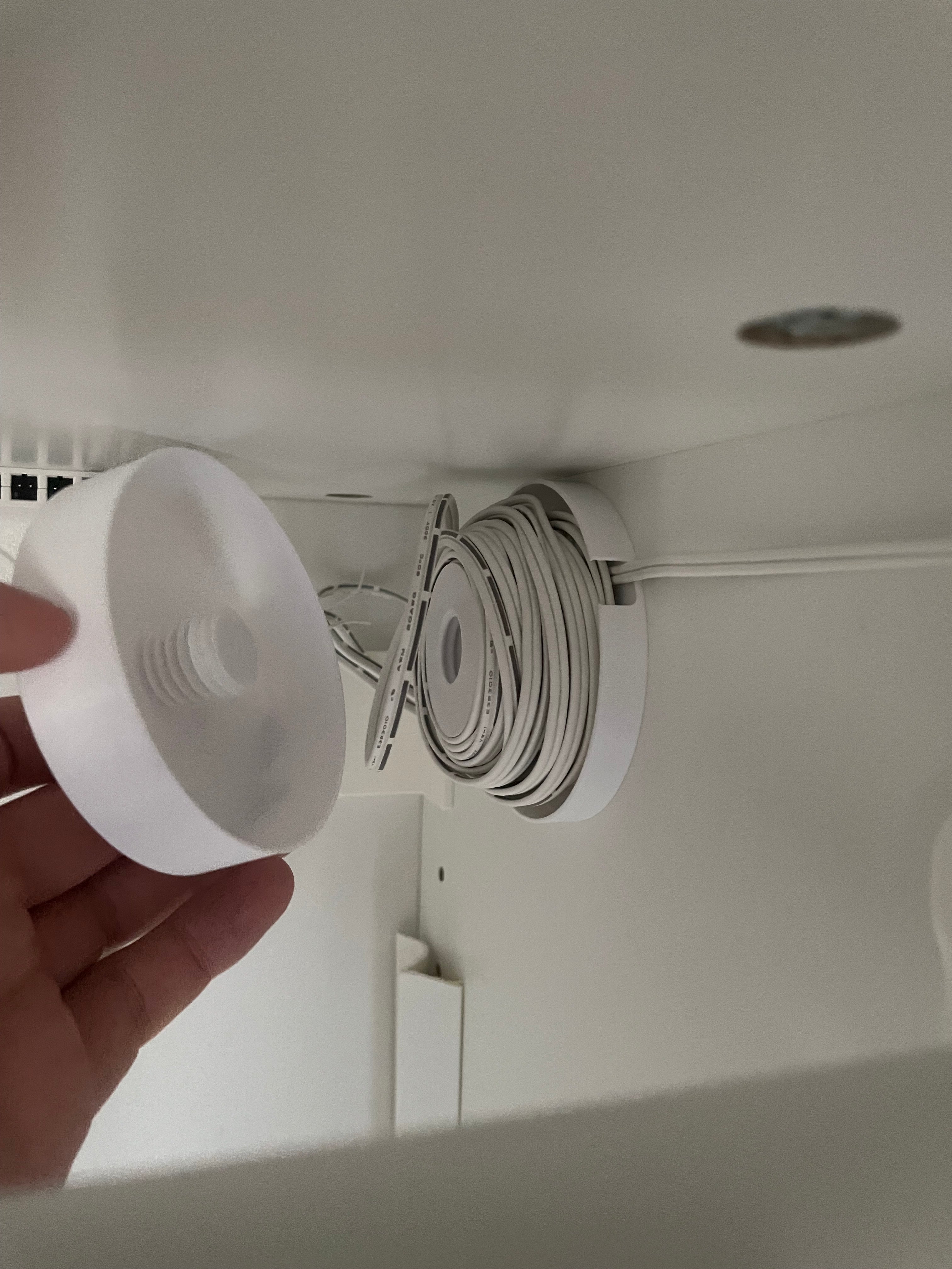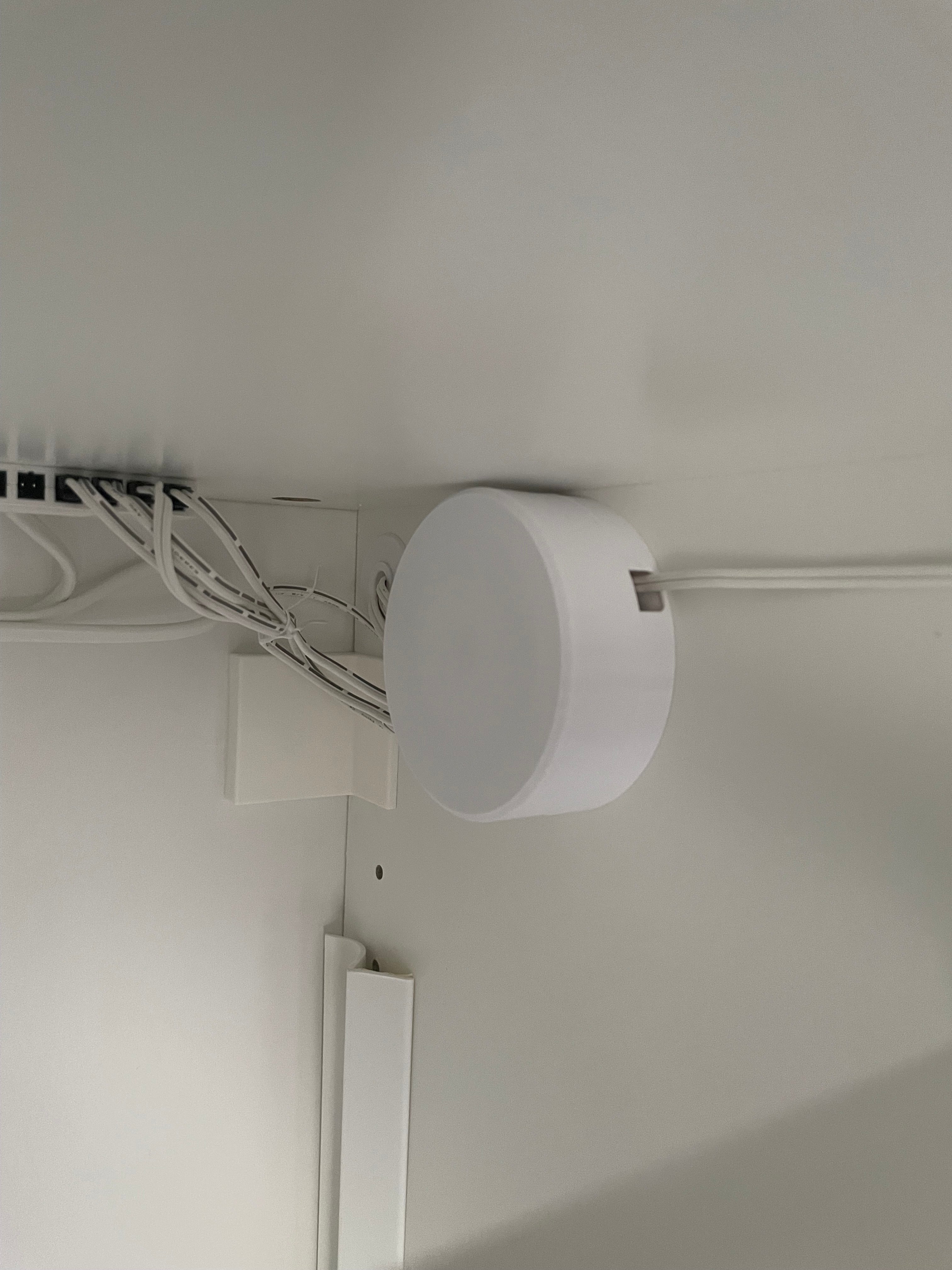 Okrągły organizer kabli do stałej instalacji. Ten produkt ma otwór w środku podstawy, dzięki czemu można go przymocować do ściany.