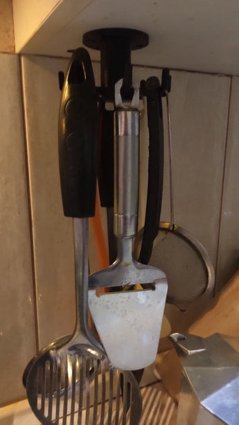 Obrotowy, wiszący uchwyt na przybory kuchenne to niezwykle praktyczne i oszczędzające miejsce rozwiązanie do każdej kuchni. Dzięki przemyślanej konstrukcji umożliwia łatwe zorganizowanie najczęściej używanych przyborów, dzięki czemu są zawsze pod ręką podczas gotowania. Innowacyjna funkcja obrotowa uchwytu zapewnia bezproblemowy dostęp do każdego narzędzia, eliminując bałagan i frustrację. Na solidnych haczykach można łatwo zawiesić kilka przyborów kuchennych, co przyczynia się do bardziej uporządkowanej i przejrzystej przestrzeni kuchennej. Ten wszechstronny uchwyt został zaprojektowany, aby zoptymalizować powierzchnię roboczą, dodając jednocześnie funkcjonalny i stylowy element do wystroju kuchni.