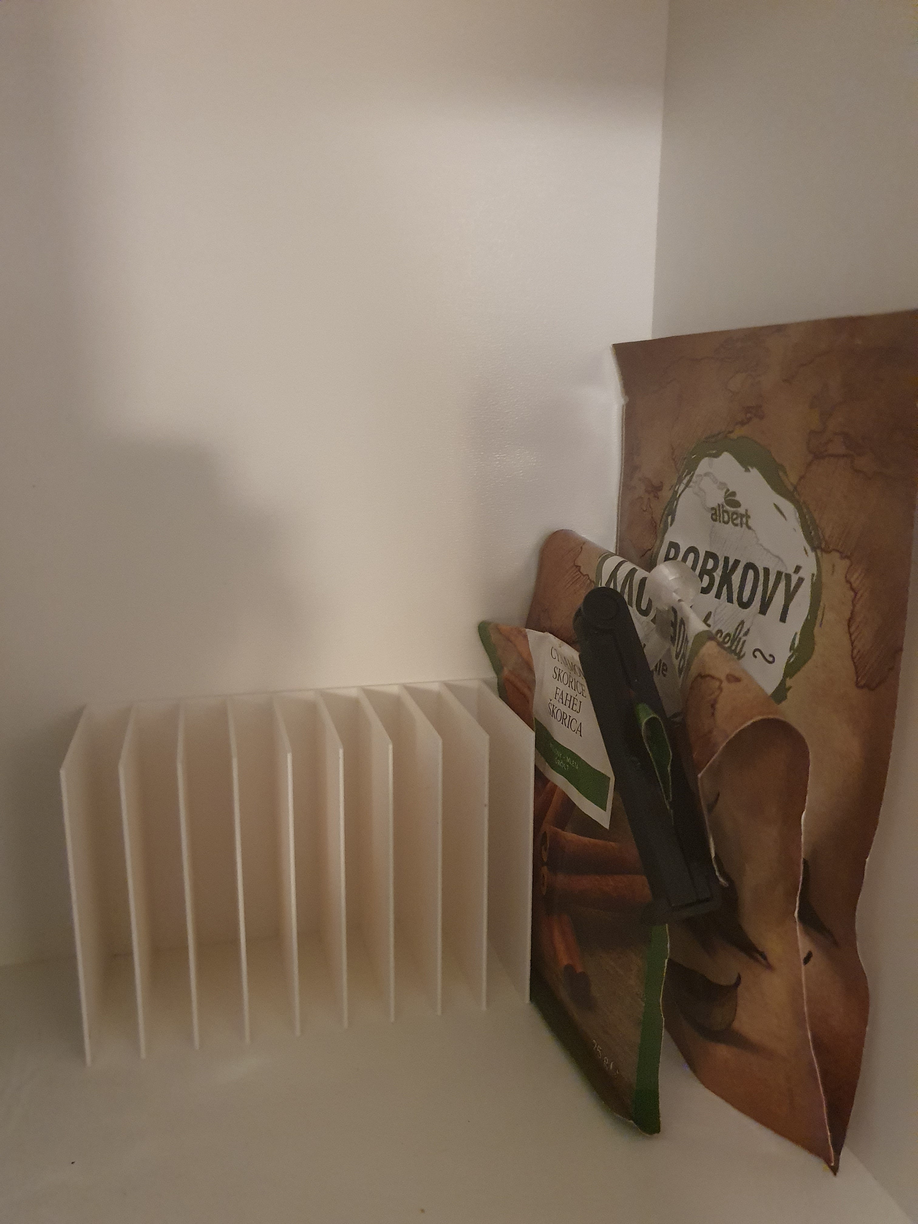 Ten organizer został zaprojektowany, aby skutecznie przechowywać saszetki z przyprawami razem i łatwo dostępne w kuchni. O wymiarach 157x50x74mm z łatwością zmieści się w większości szuflad lub szafek i pomoże stworzyć przegląd przypraw. Odstępy 11 mm między komorami zapewniają, że każda saszetka ma swoje miejsce, co upraszcza wybór podczas gotowania i zmniejsza bałagan. Organizer można również łatwo przymocować za pomocą taśmy dwustronnej dla zwiększenia stabilności, jeśli jest to pożądane, co przyczynia się do bardziej zorganizowanej i funkcjonalnej przestrzeni kuchennej.