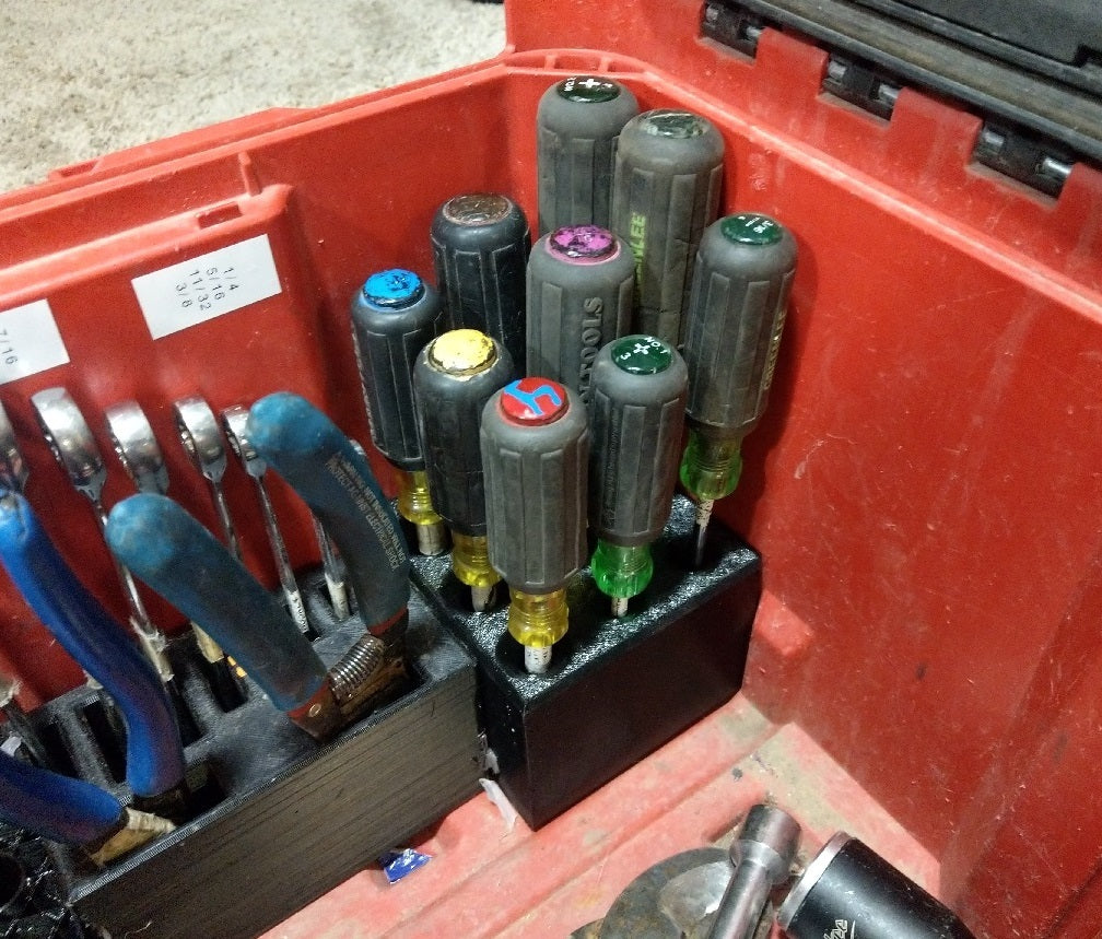 Organizer jest od samego początku zaprojektowany tak, aby pomieścić różnorodne popularne śrubokręty, w tym cztery śrubokręty Greenlee i pięć śrubokrętów do nakrętek Klein. Ten uchwyt na śrubokręt zapewnia, że narzędzia są bezpiecznie na swoim miejscu i zapobiega ich luźnemu leżeniu w skrzynce.