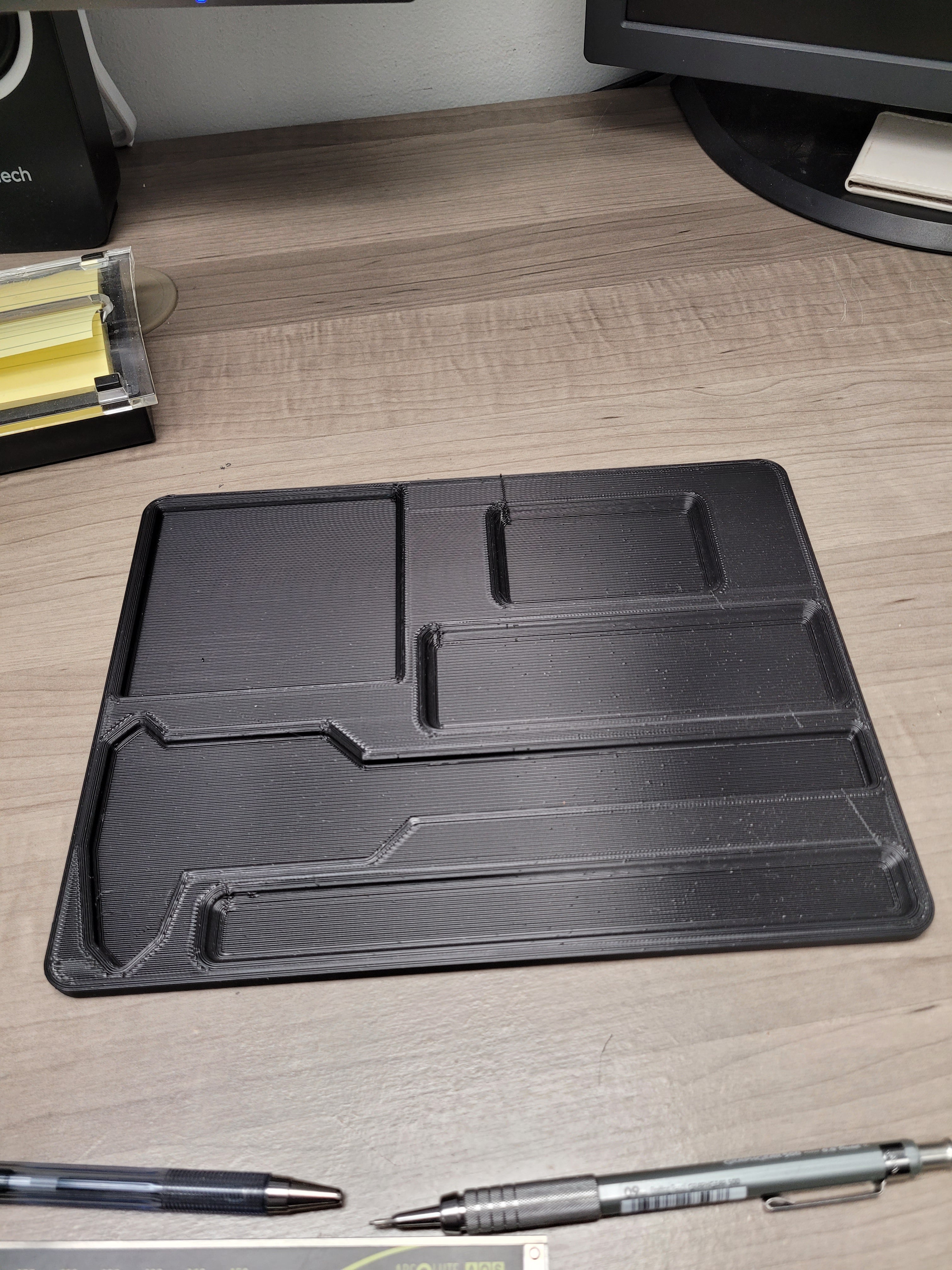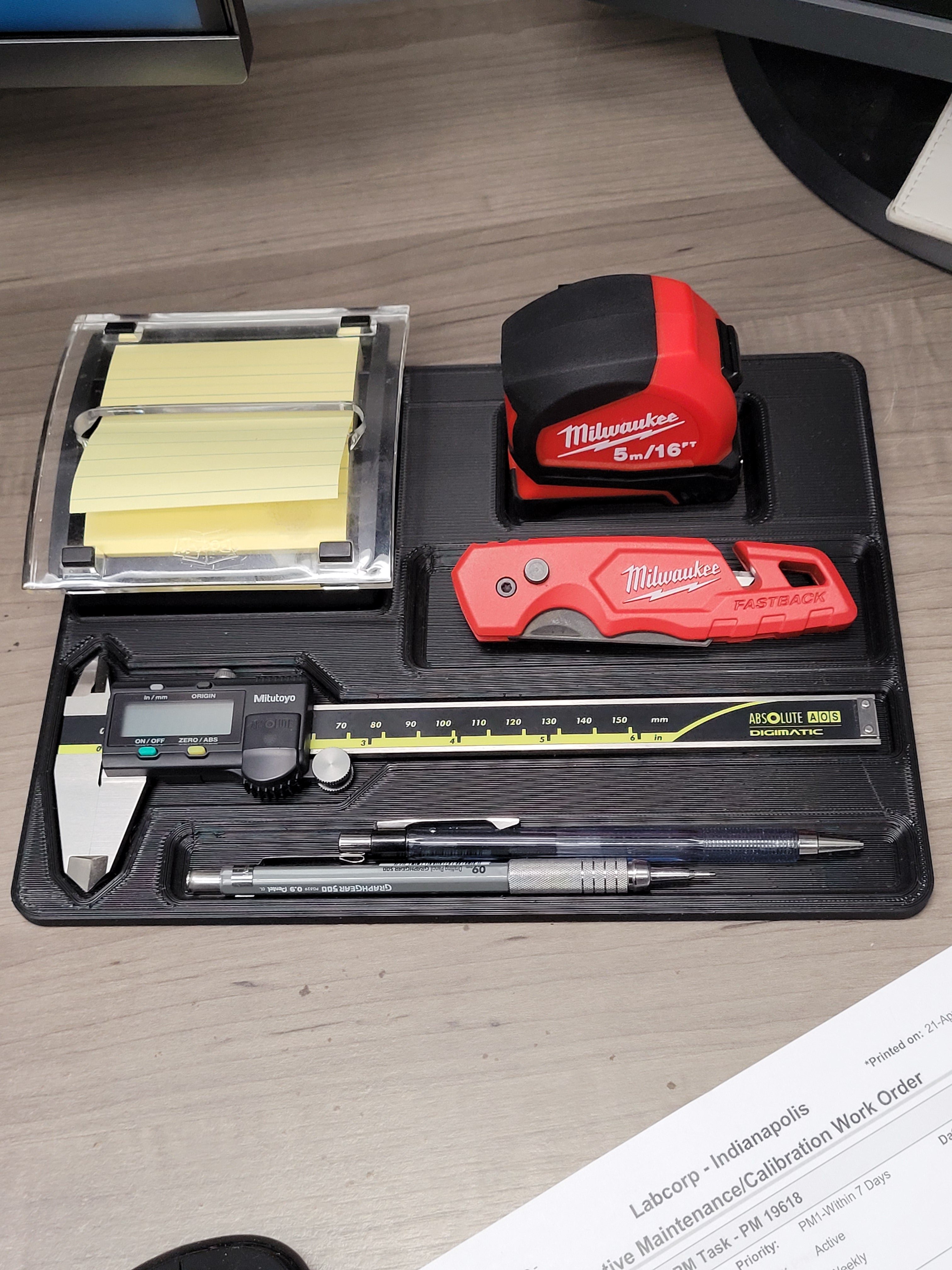 Organizer na biurko z kalibrem Mitutoyo oraz taśmą mierniczą i nożem Milwaukee
