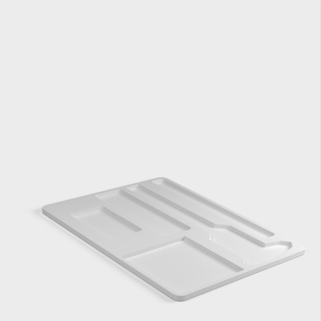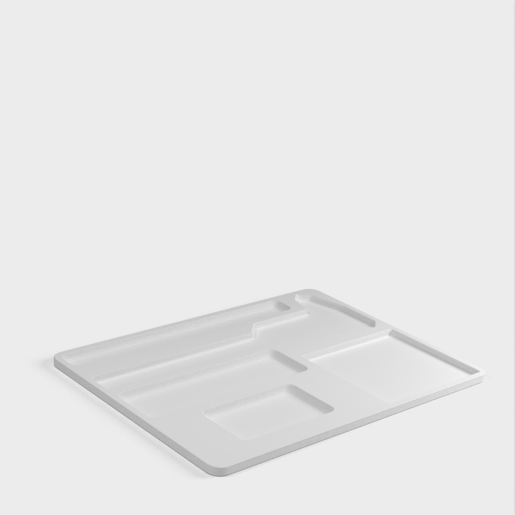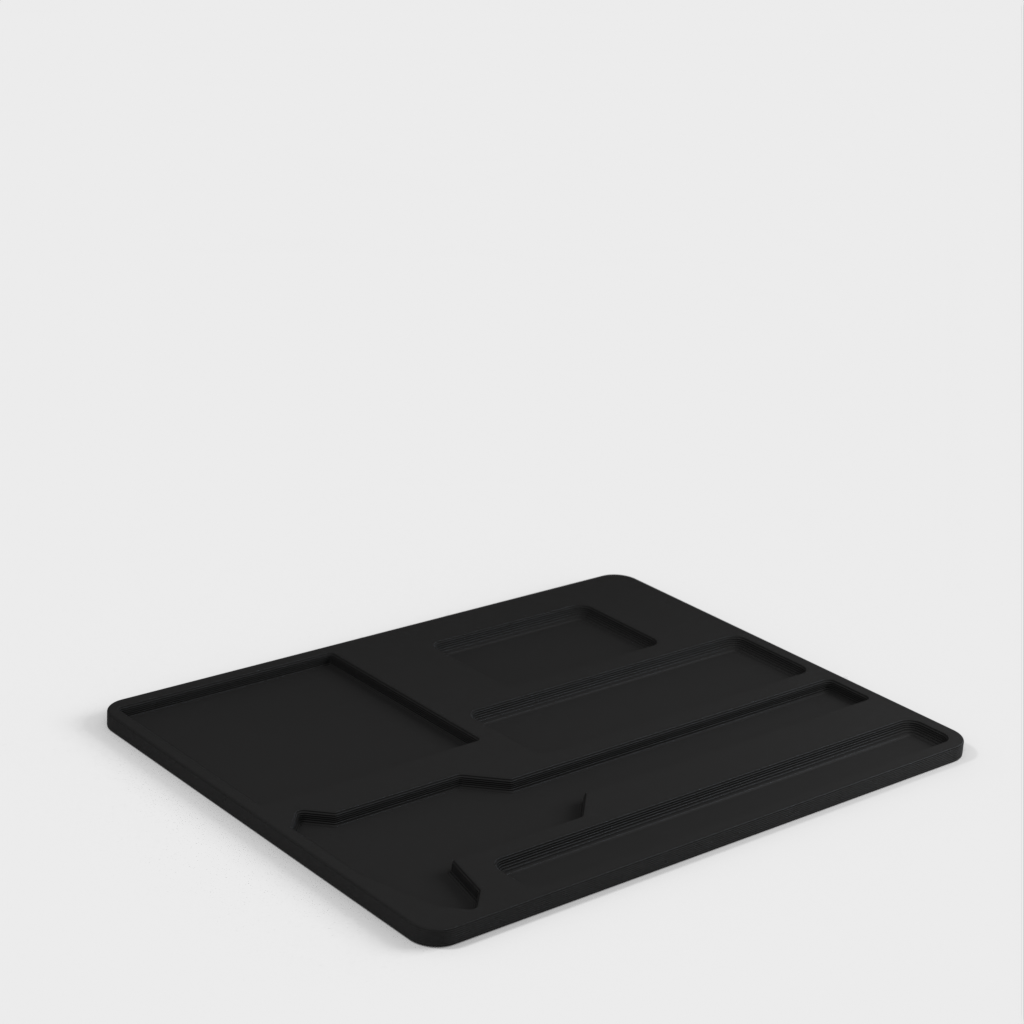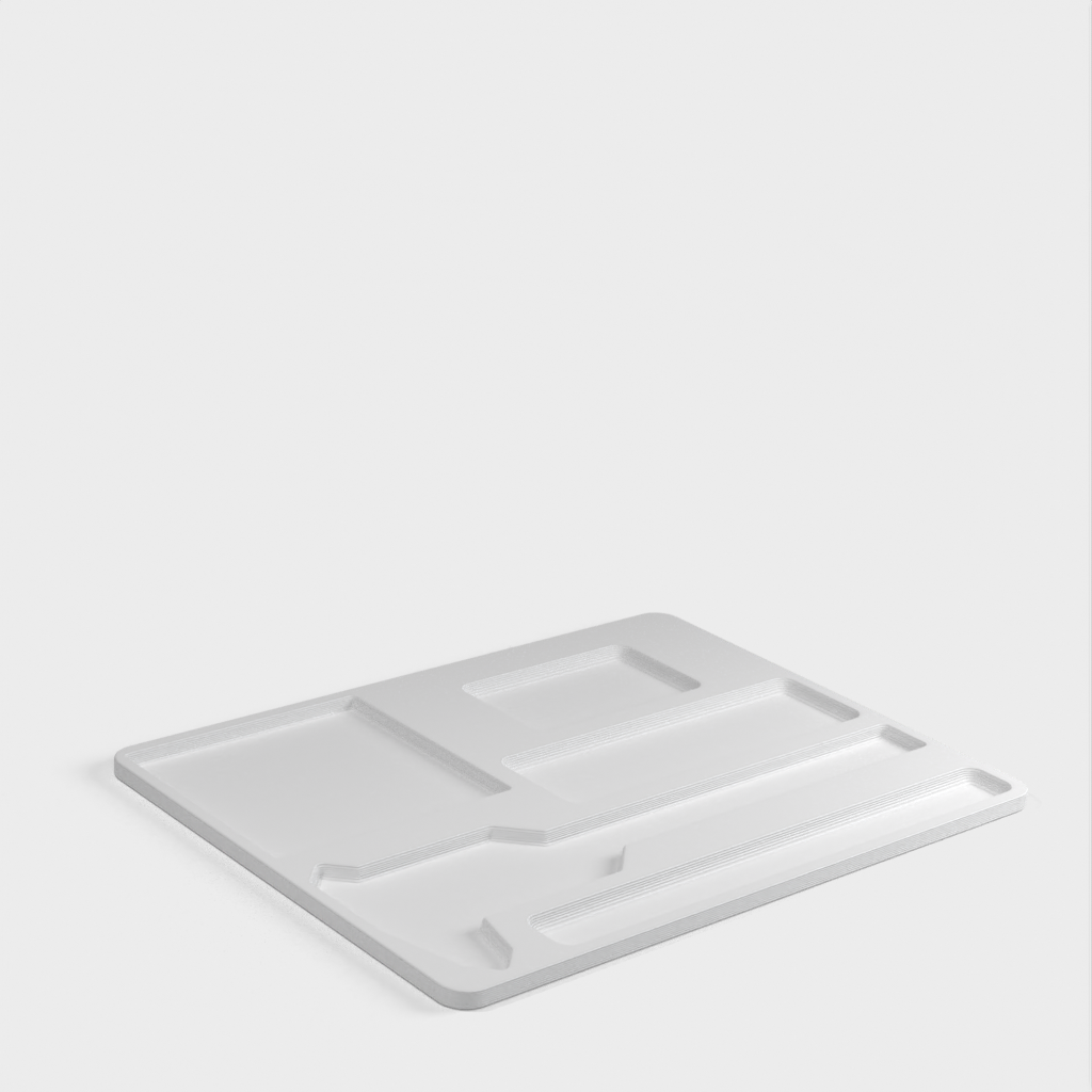 Jest to sortownik biurkowy, który zawiera różne narzędzia i elementy potrzebne do zorganizowanego i funkcjonalnego miejsca pracy. Obejmuje on miernik śrub CD-6' ASX Mitutoyo, taśmę mierniczą Milwaukee 48-22-6617, nóż uniwersalny Milwaukee 48-22-1501 i uchwyt Post-it Pop Up na notatki. Jest też miejsce na długopisy, ołówki i podobne niezbędne przedmioty.