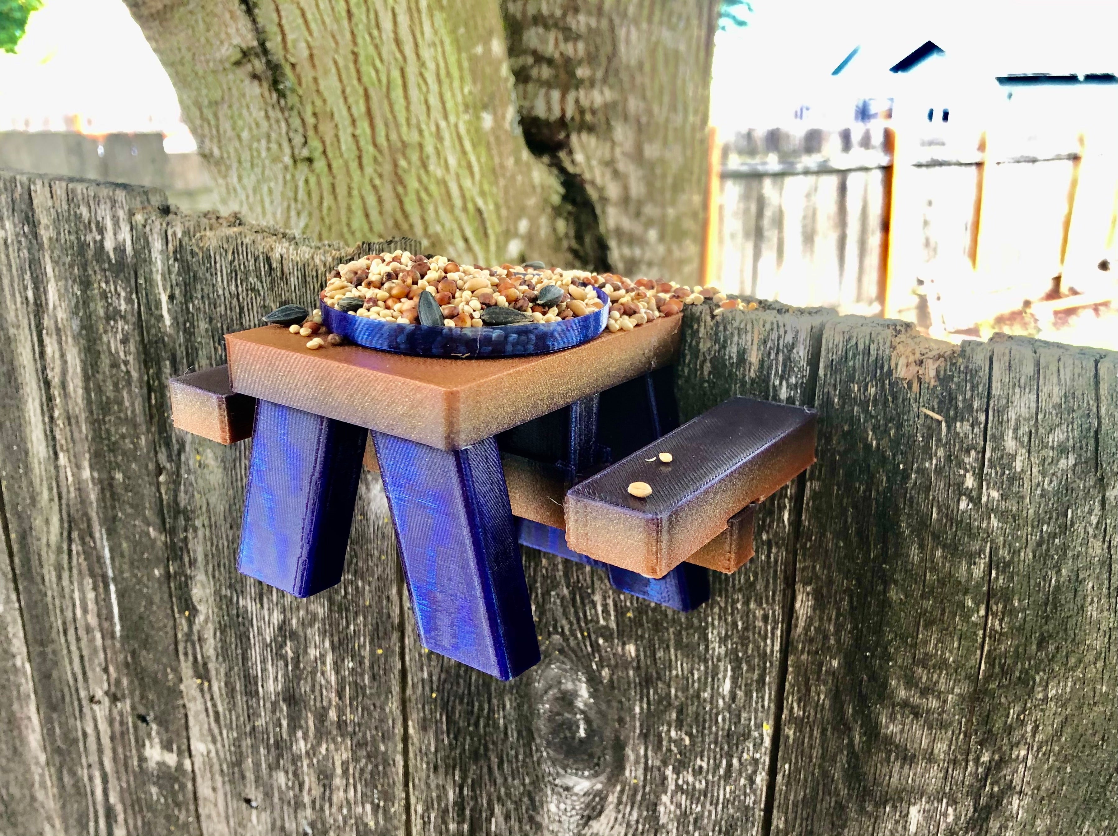 Ławka do karmienia wiewiórek w stylu piknikowym – do montażu na ogrodzeniu