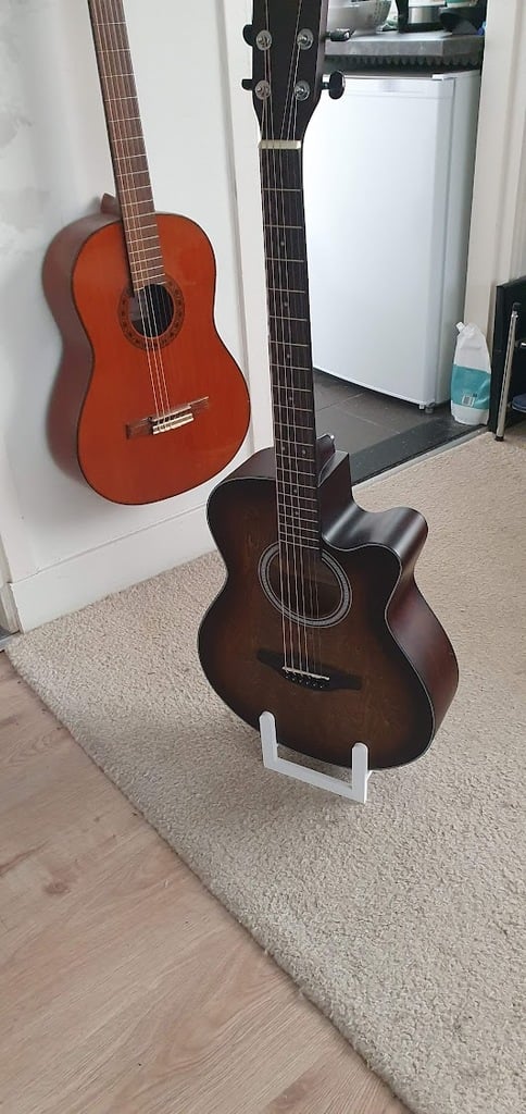 Prosty stojak na gitarę zaprojektowany do przechowywania gitary w uporządkowany sposób. Ten stojak na gitarę jest idealny zarówno do sypialni, jak i pokoju muzycznego. Dzięki solidnej konstrukcji zapewnia bezpieczne umieszczenie instrumentu muzycznego, gdy nie jest używany.