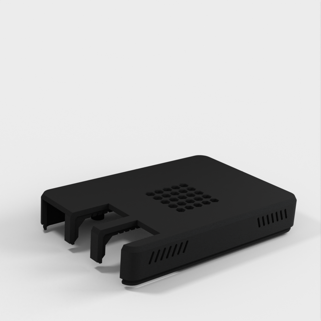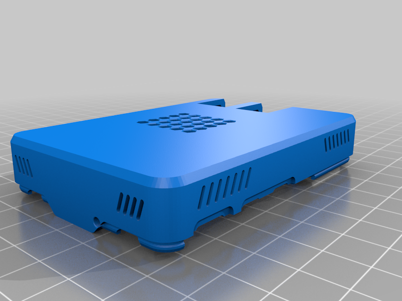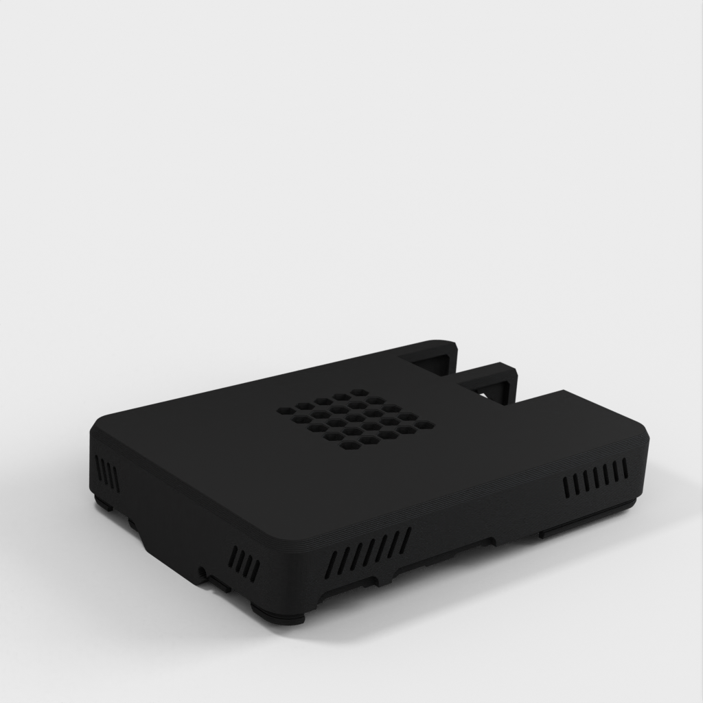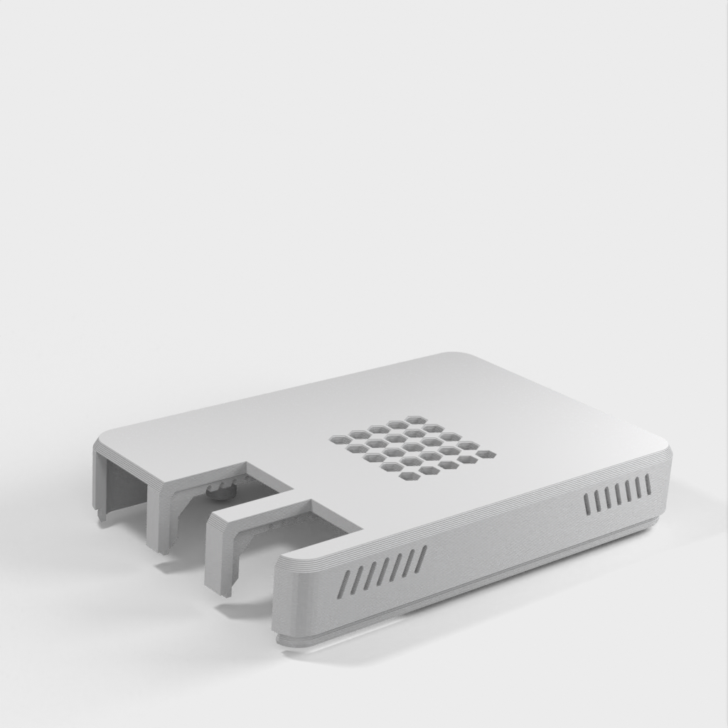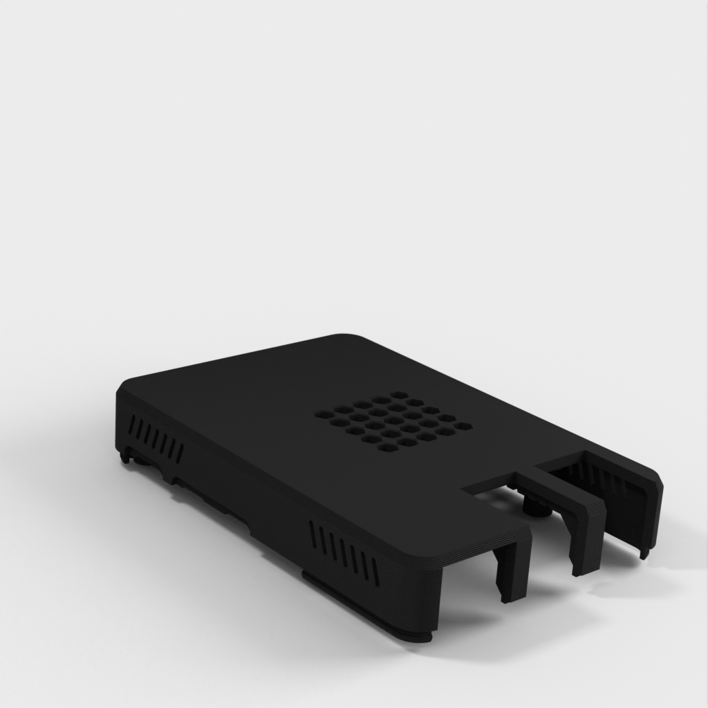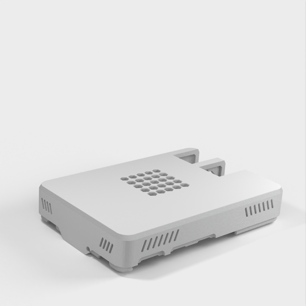 Prosta obudowa dla Raspberry Pi 5 z 2023 r. Zmiany obejmują zmianę położenia złączy USB i LAN, usunięcie gniazda słuchawkowego i dodanie małego otworu na przycisk resetowania. Dodano otwory wentylacyjne, aby pasowały do oryginalnej chłodnicy.