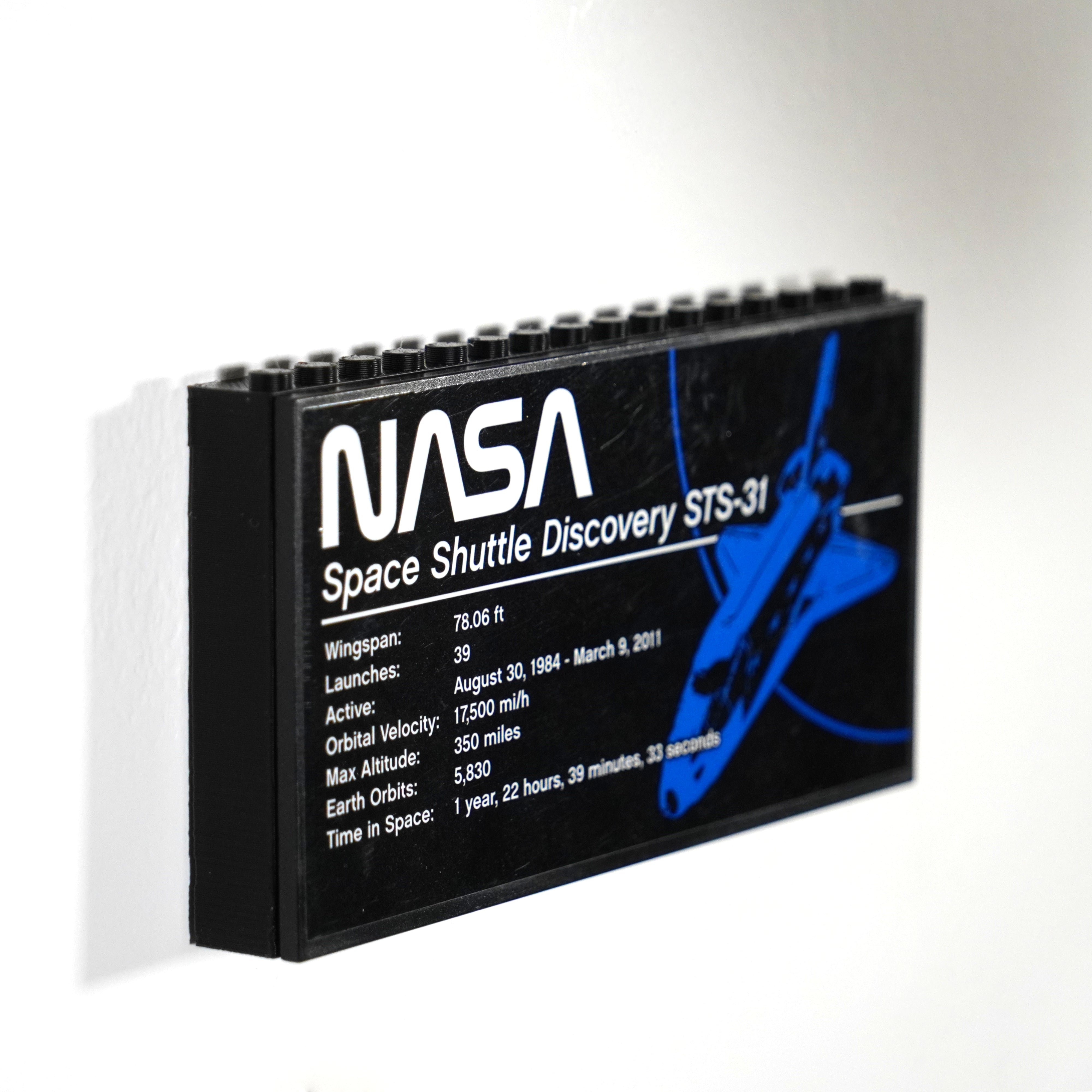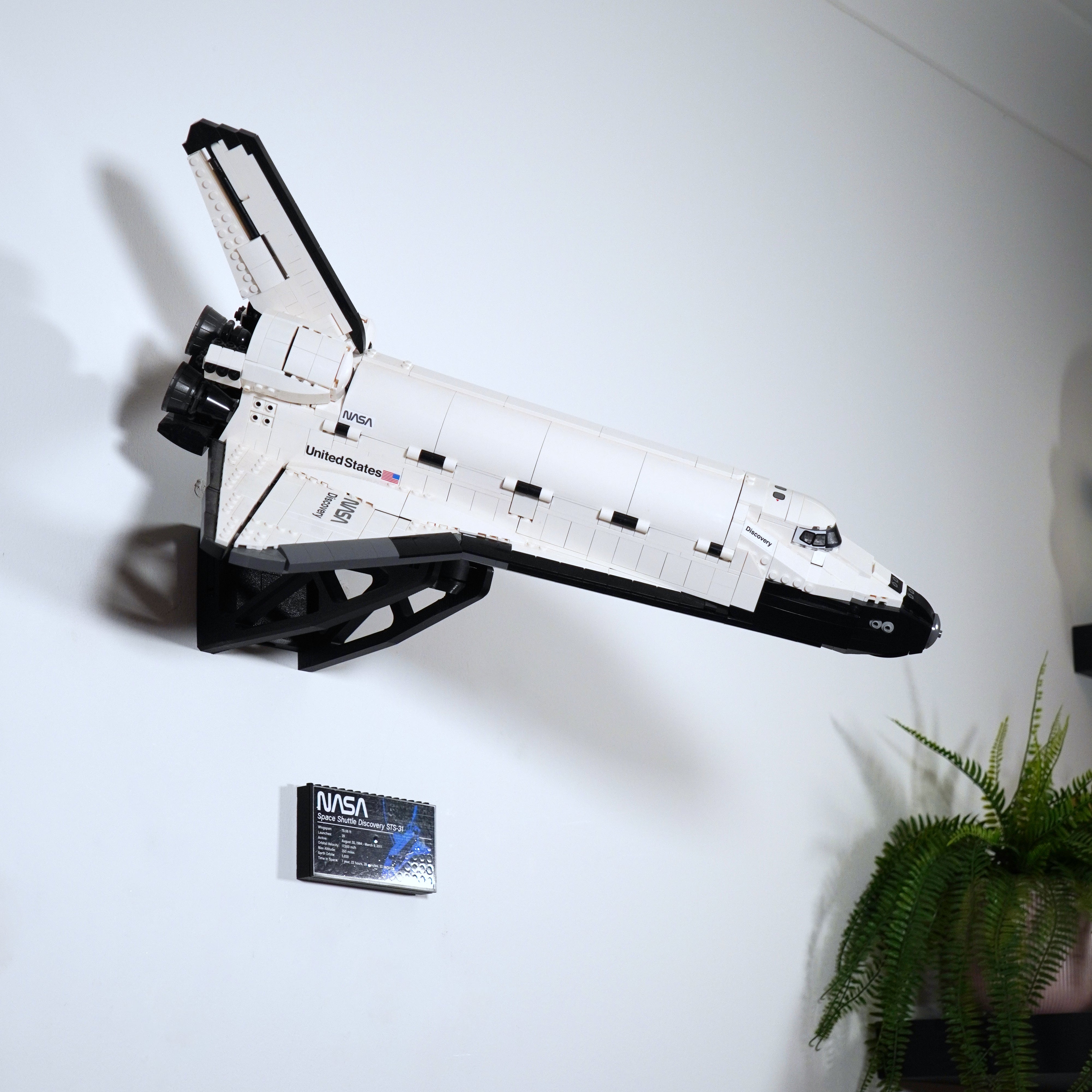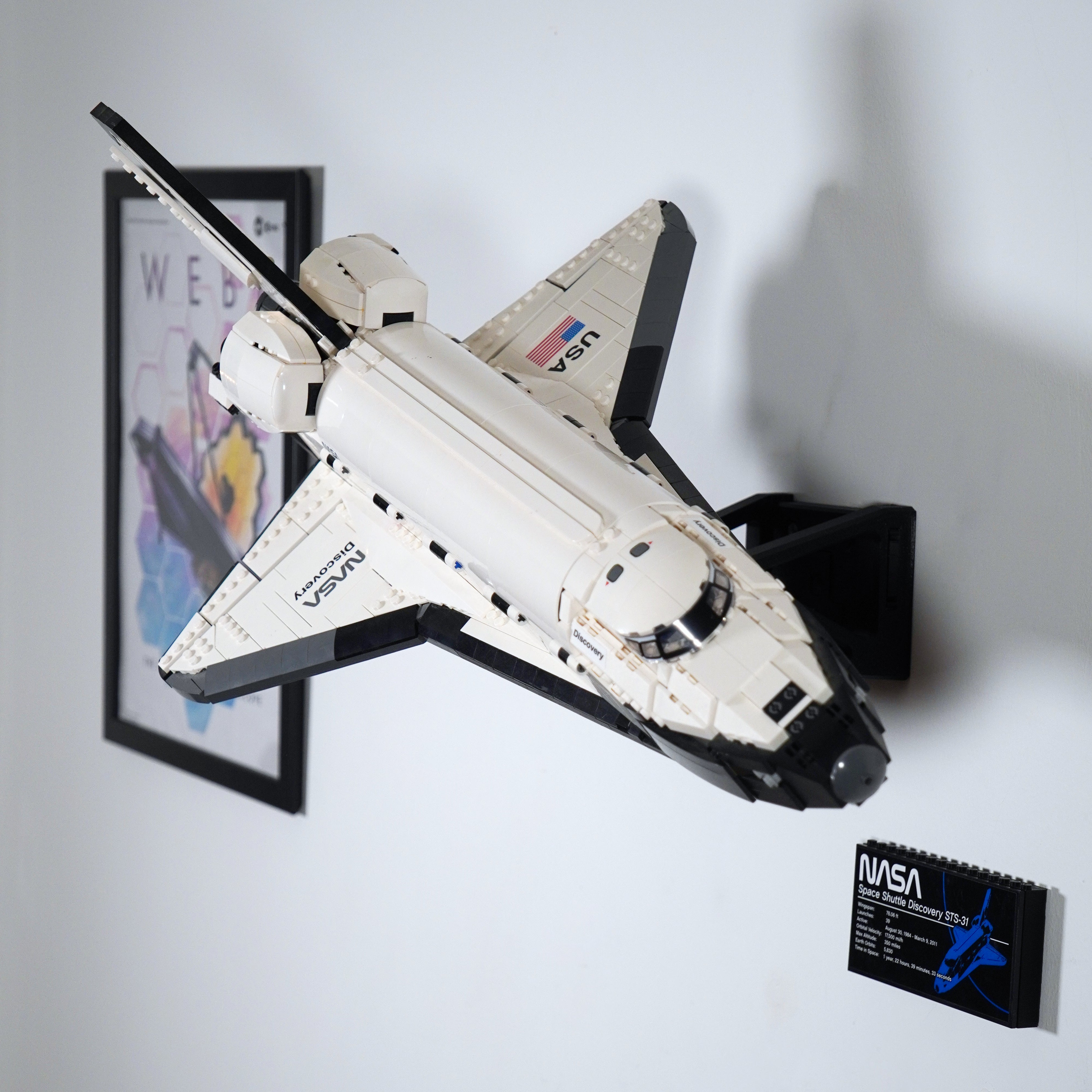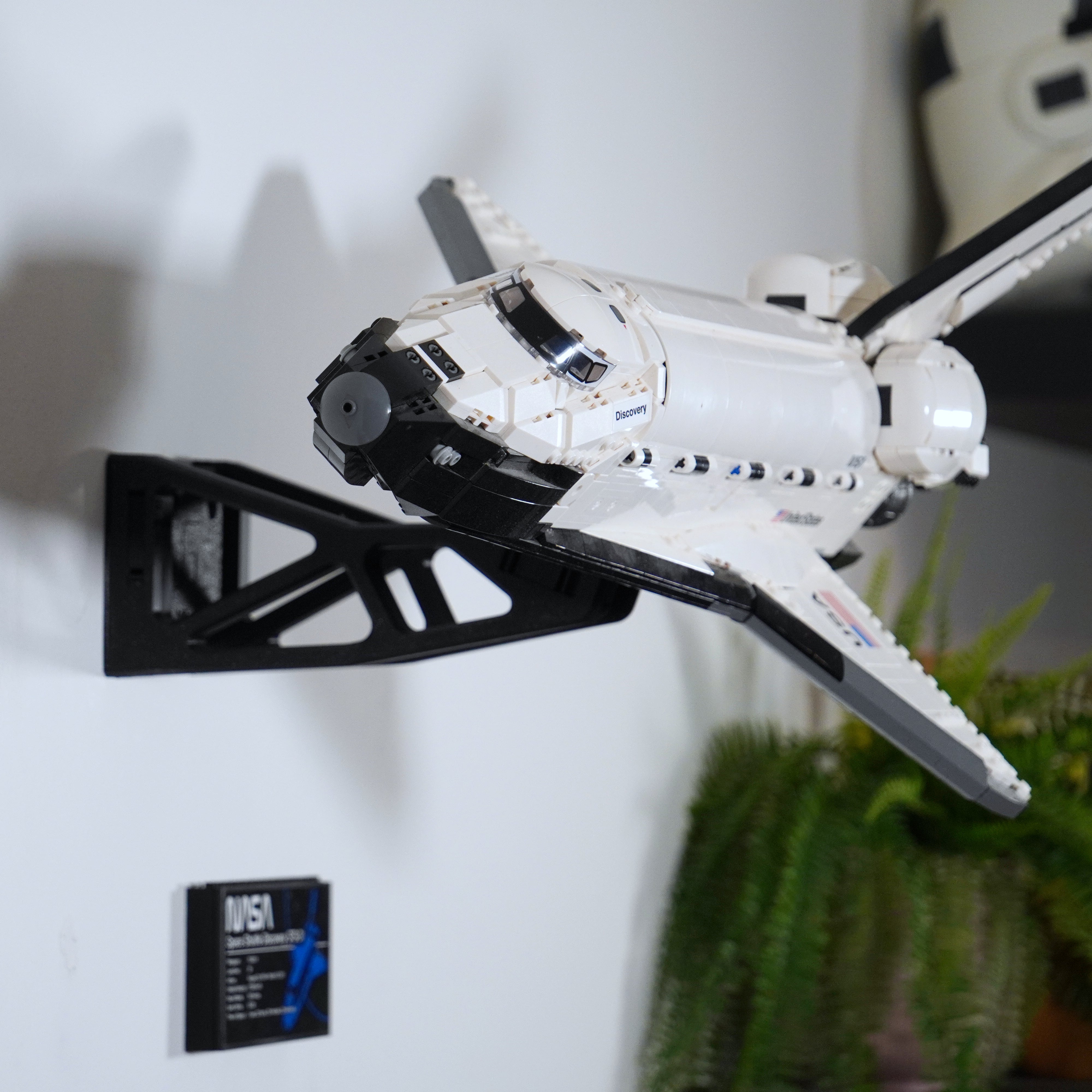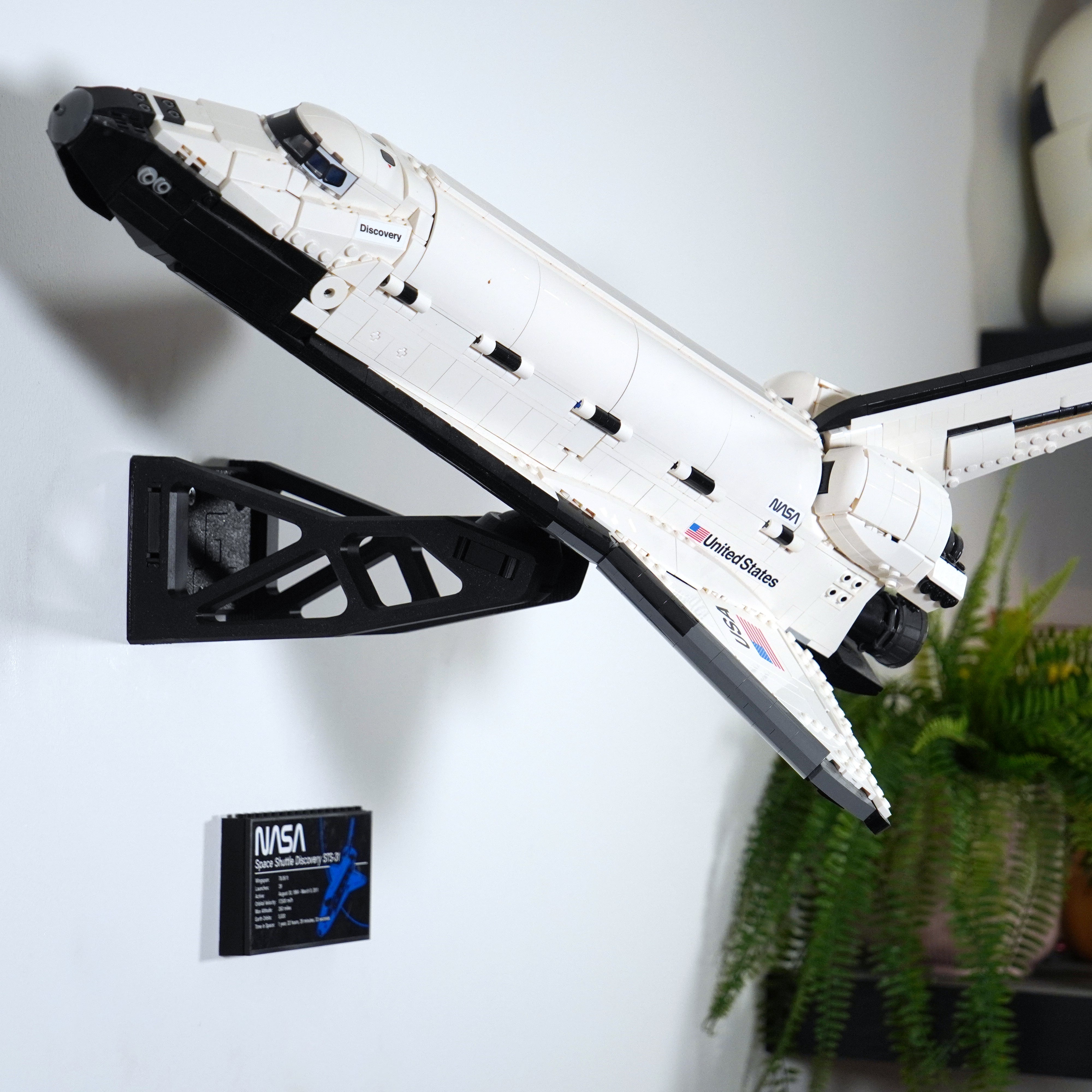 - Uchwyt ścienny do LEGO Space Shuttle Discovery 10283, zapewniający stabilną ekspozycję.