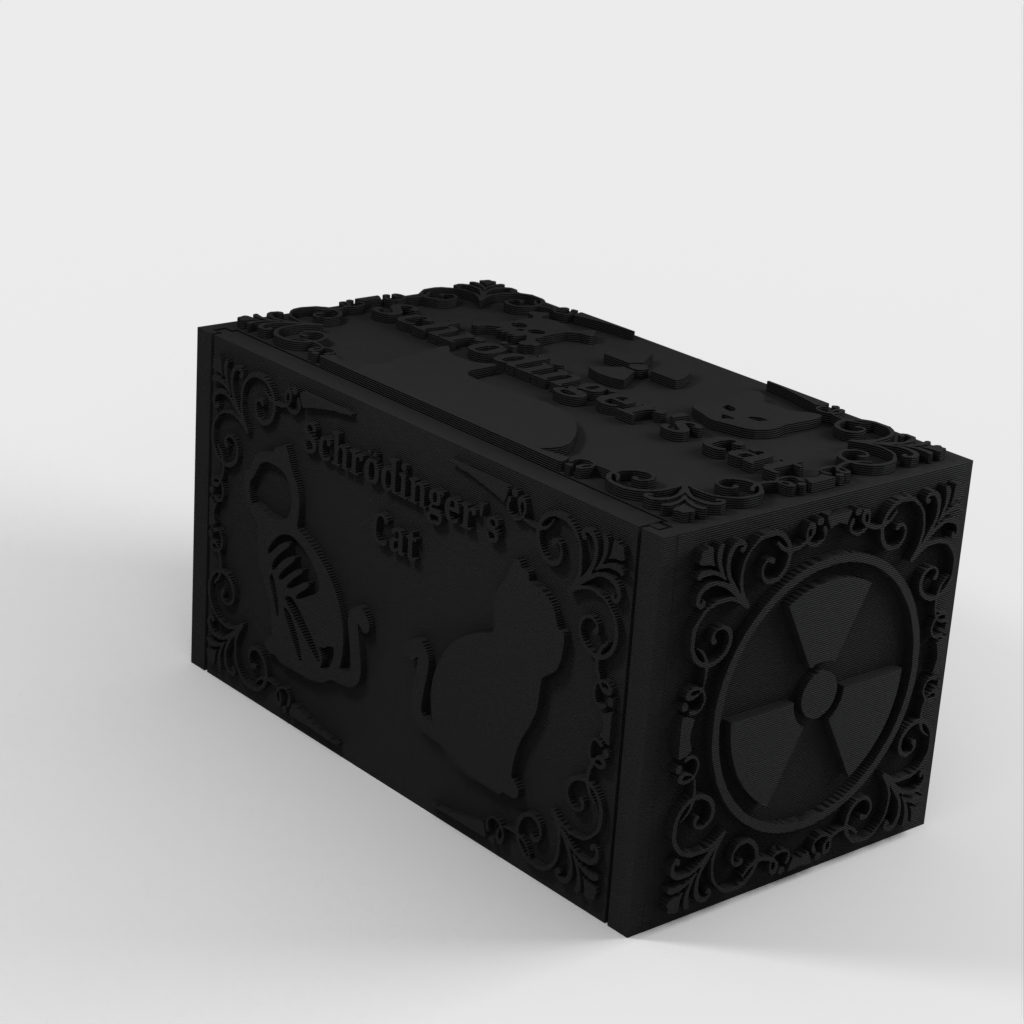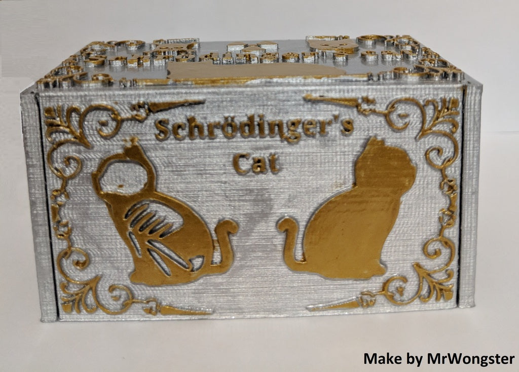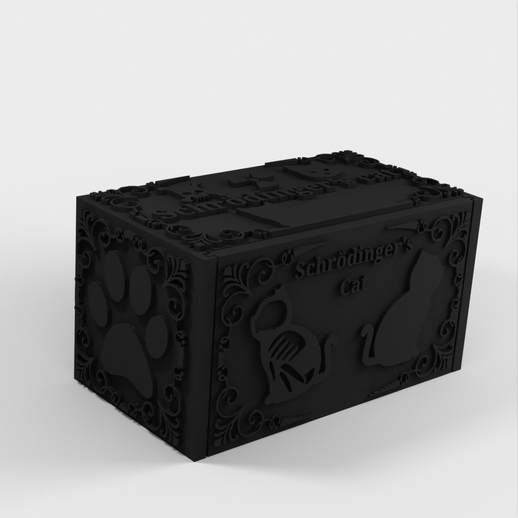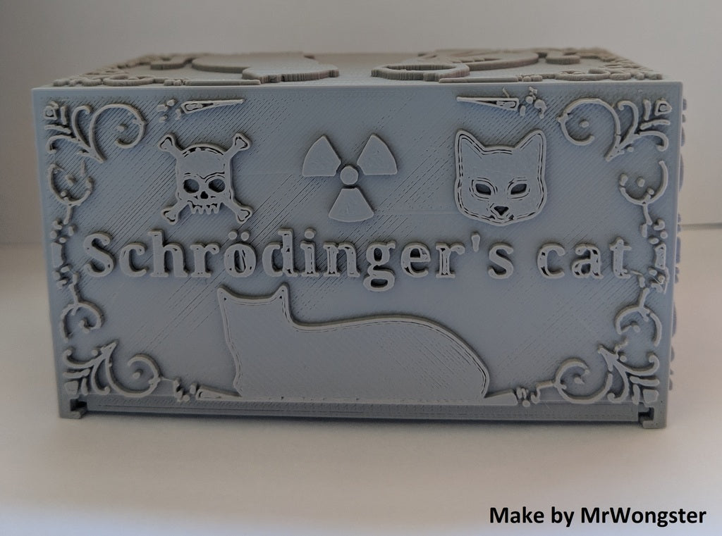 Schrödinger's Cat to model do druku 3D, który ilustruje eksperyment myślowy Erwina Schrödingera. Po pobraniu niezbędnych plików można wybrać losowy plik STL zawierający żywego lub martwego kota. Niezależnie od tego, czy wybierzesz jeden, czy drugi, zorientujesz się, który model wybrałeś, dopiero po zakończeniu drukowania i otwarciu pudełka. Ten produkt służy jako początek rozmowy, ilustracja fizyki kwantowej i zabawna dekoracja pulpitu dla wszystkich entuzjastów fizyki.