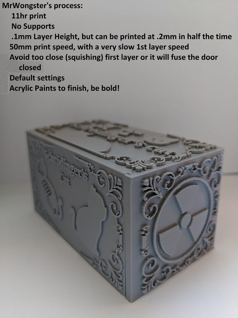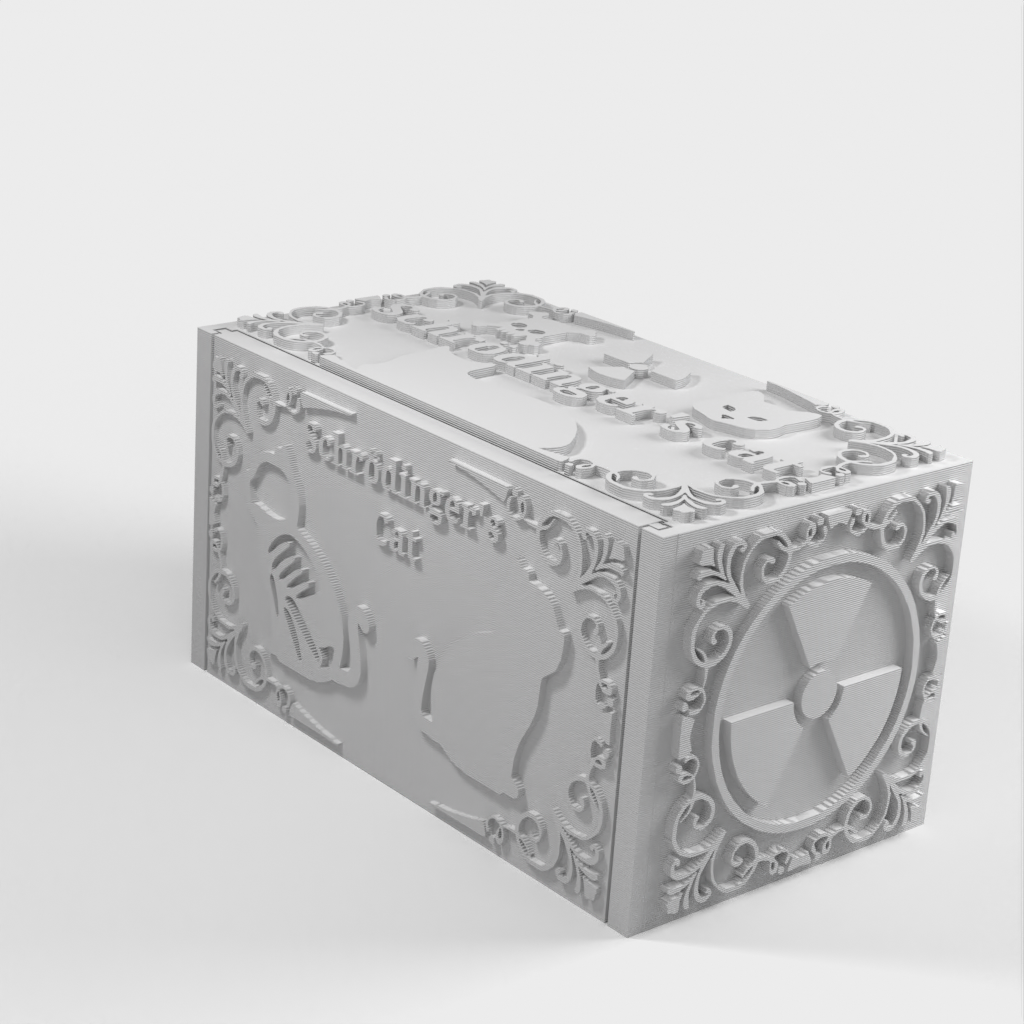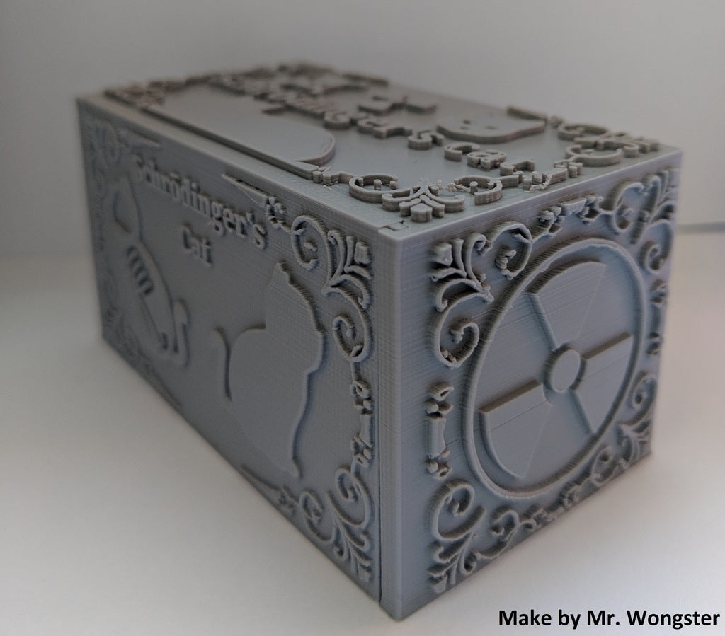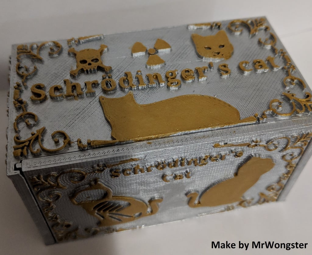 Schrödinger's Cat to model do druku 3D, który ilustruje eksperyment myślowy Erwina Schrödingera. Po pobraniu niezbędnych plików można wybrać losowy plik STL zawierający żywego lub martwego kota. Niezależnie od tego, czy wybierzesz jeden, czy drugi, zorientujesz się, który model wybrałeś, dopiero po zakończeniu drukowania i otwarciu pudełka. Ten produkt służy jako początek rozmowy, ilustracja fizyki kwantowej i zabawna dekoracja pulpitu dla wszystkich entuzjastów fizyki.