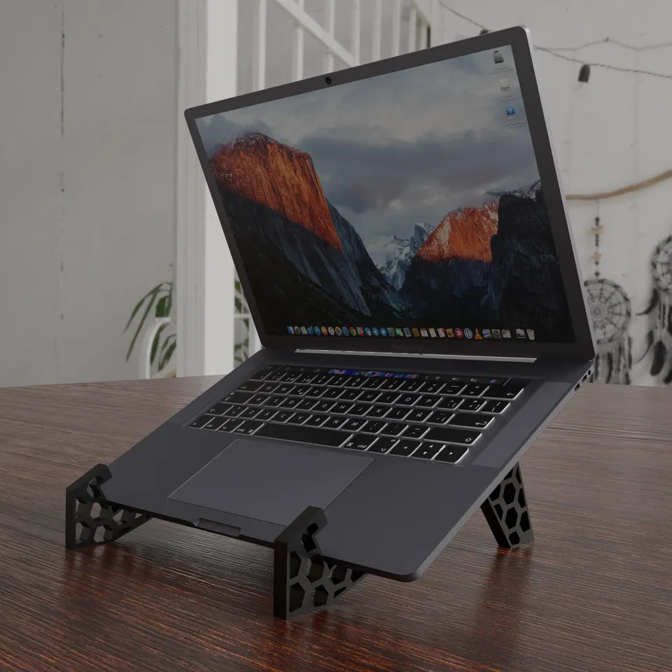 Prosta podstawka pod laptopa/przenośna, pasująca do większości laptopów. Pasuje zarówno do MacBooka Pro, jak i MacBooka Air. Jest wykonany w tak zwanym kształcie plastra miodu, a 4 części łatwo się ze sobą łączą bez użycia śrub lub czegokolwiek innego.