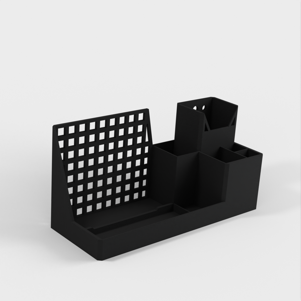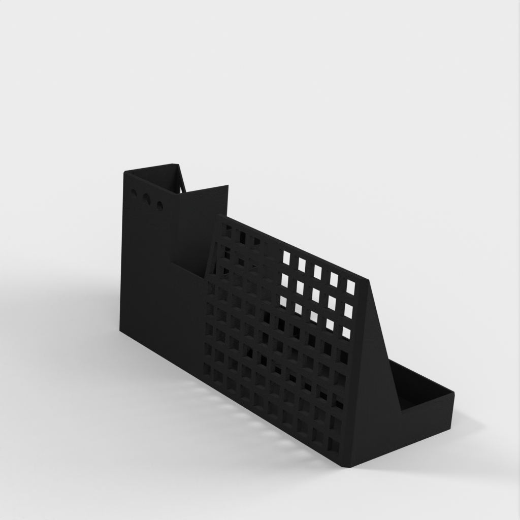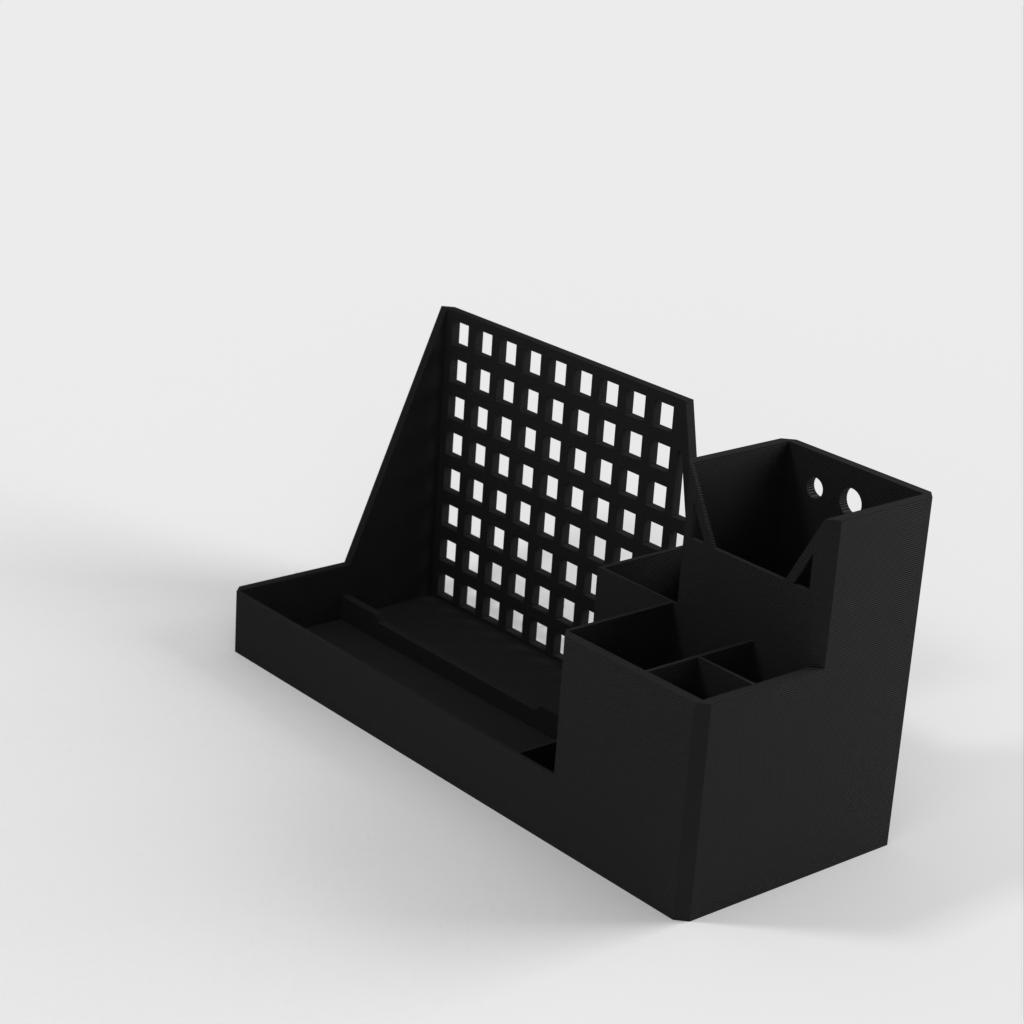 Podstawka pod tablet i organizer na biurko, zaprojektowane z myślą o efektywnej organizacji miejsca pracy. Posiada specjalnie zaprojektowane otwory do bezpiecznego przechowywania tabletu, a także oferuje dodatkowe miejsce do przechowywania materiałów biurowych.