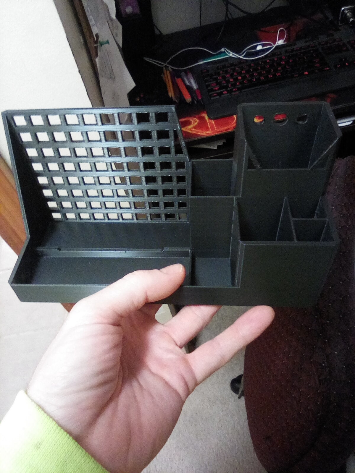 - Zawiera dedykowane przegródki do przechowywania różnych materiałów biurowych.