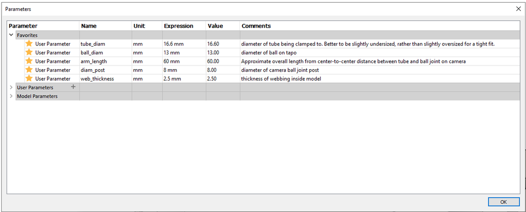 Model jest w pełni skalowalny, dzięki czemu można łatwo dostosować główne wymiary w Fusion360, jeśli masz ramę/rurę o innym rozmiarze lub przegub kulowy + gniazdo o innym rozmiarze w kamerze.