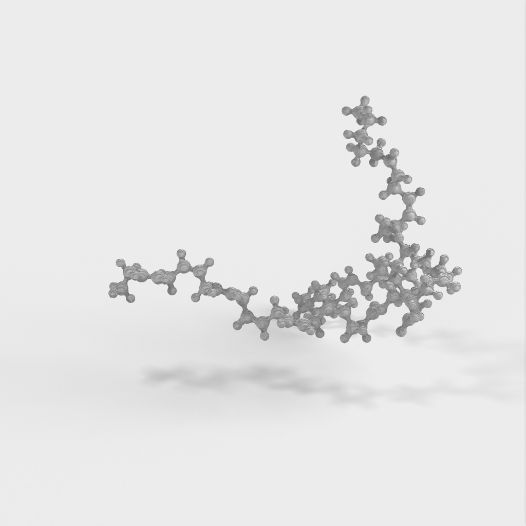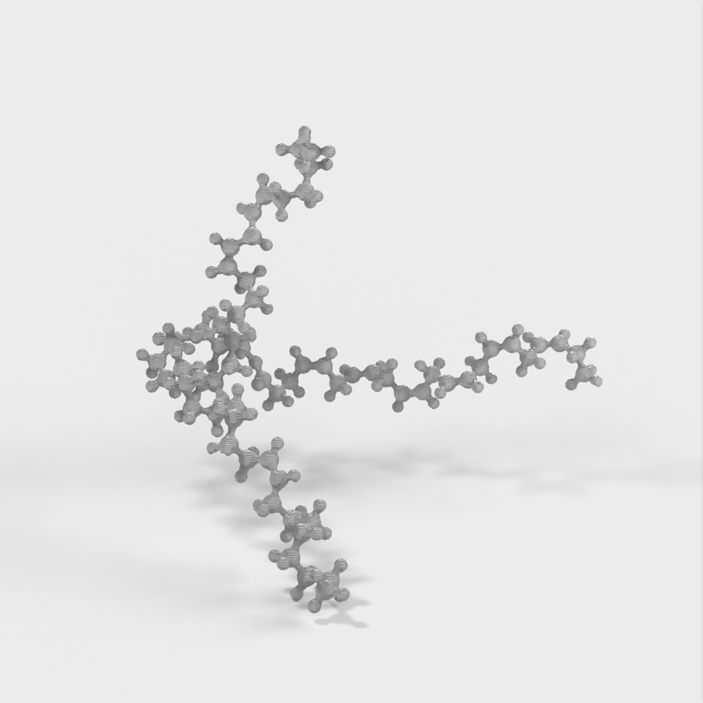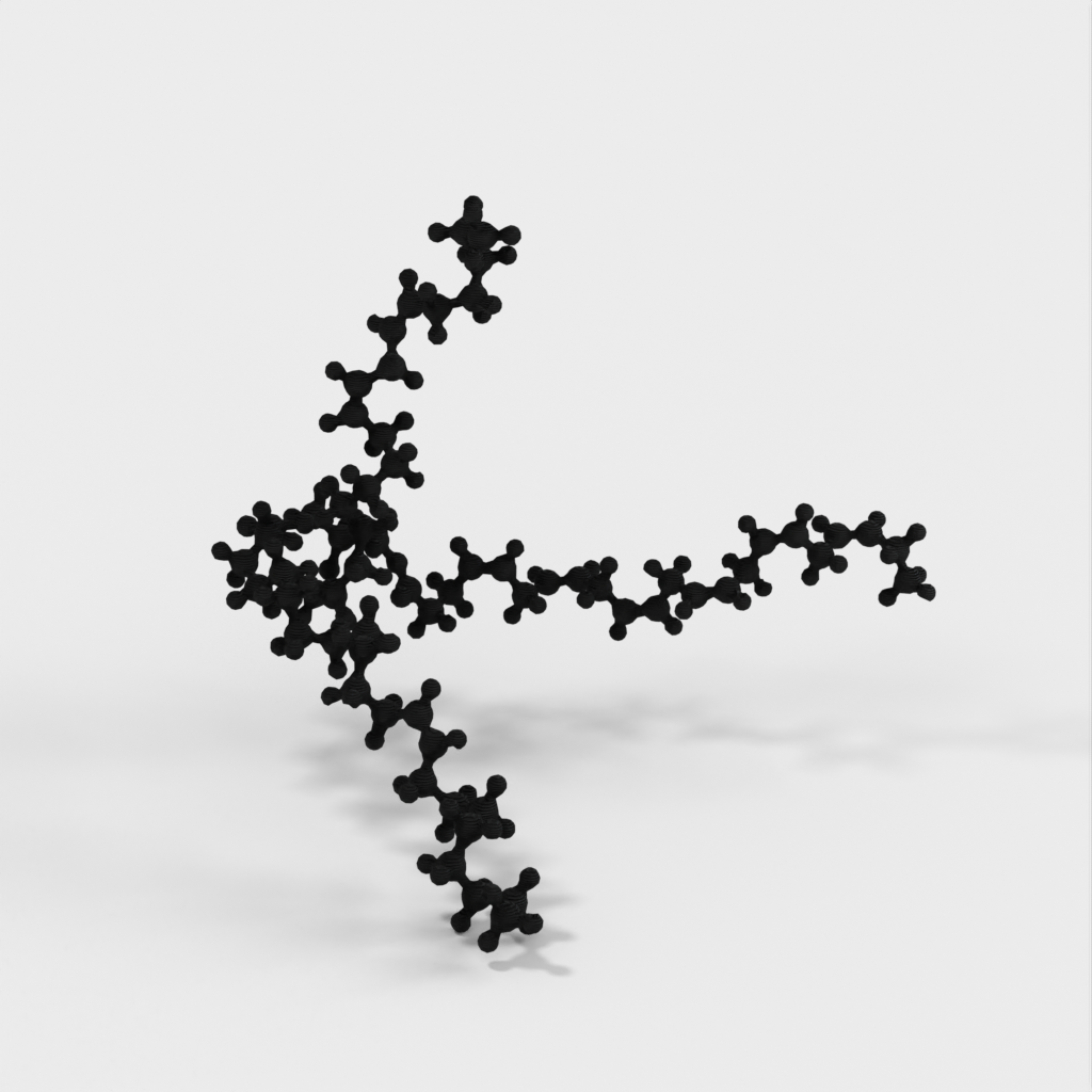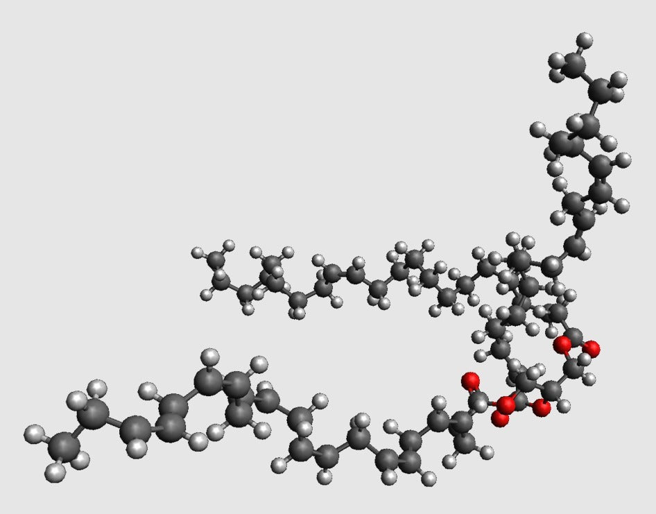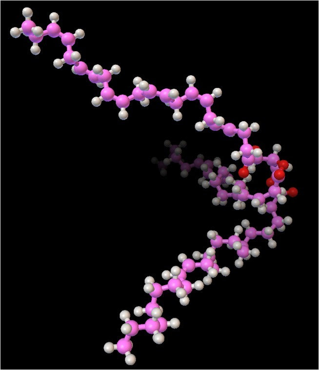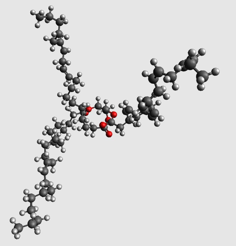 Przyjazny dla 3D model molekularny triacyloglicerolu w skali atomowej. Użyj tego modelu, aby uczyć dzieci o chemii, zwłaszcza o różnych aspektach jedzenia i budulcu ciała oraz energii (ten model reprezentuje prosty tłuszcz).