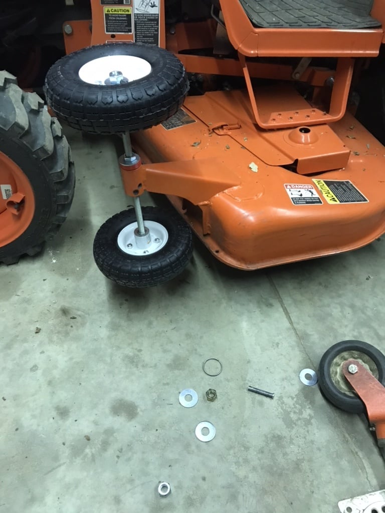Aby zamontować kosiarkę za pomocą tego wspornika, należy go połączyć z kołami i oponami (np. z Harbor Freight), prętem gwintowanym 5/8" (ok. 45 cm), podkładkami i nakrętkami. To rozwiązanie tworzy stabilny stojak, który zapewnia bezpieczne ustawienie kosiarki Kubota B2650 RCK-60-30BA, gdy nie jest używana.