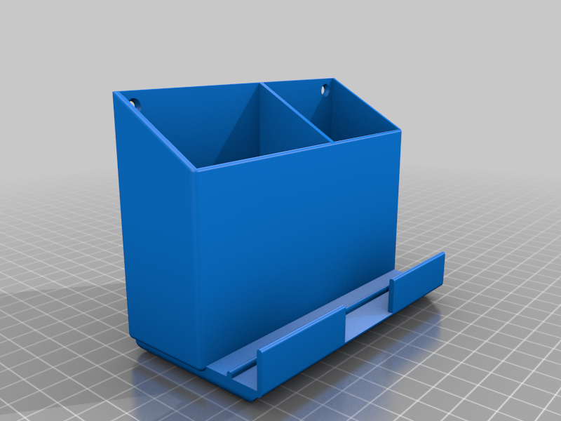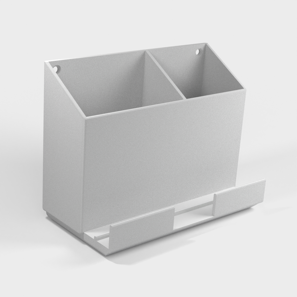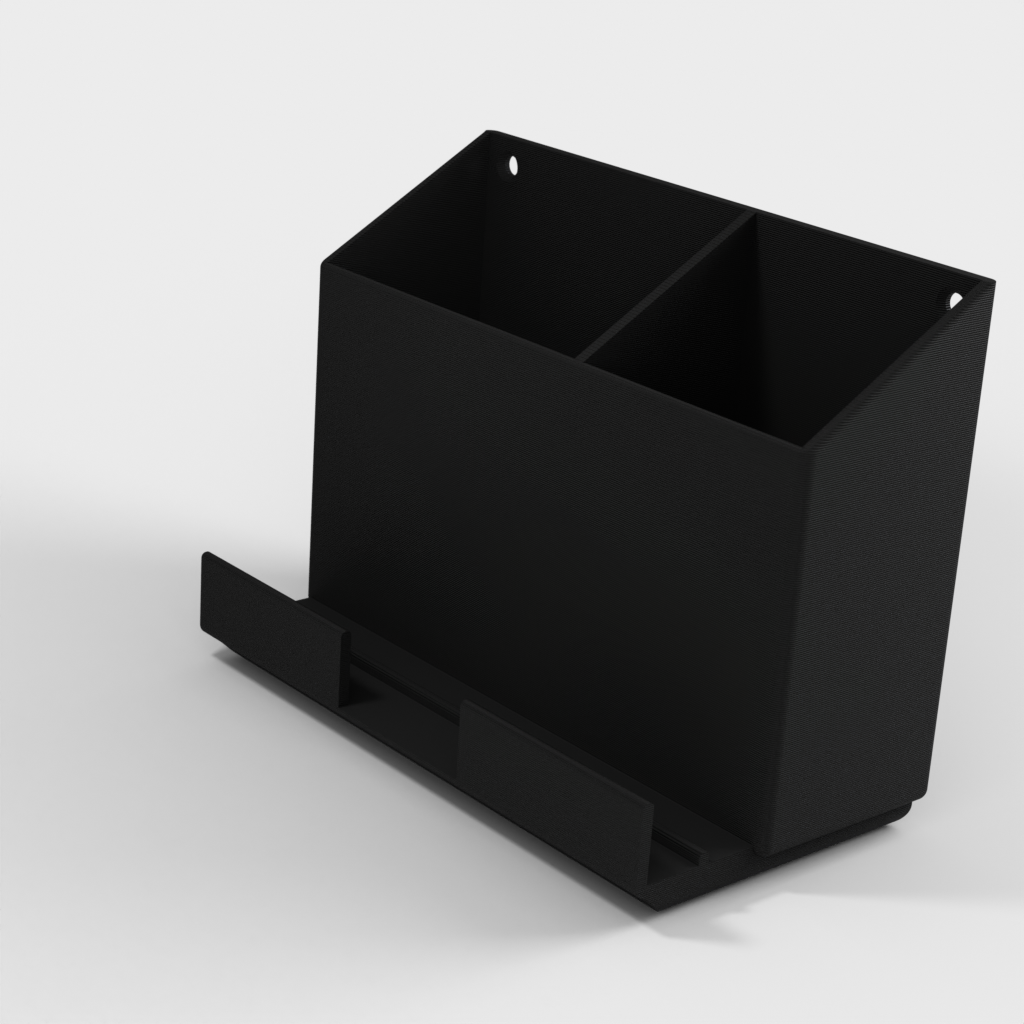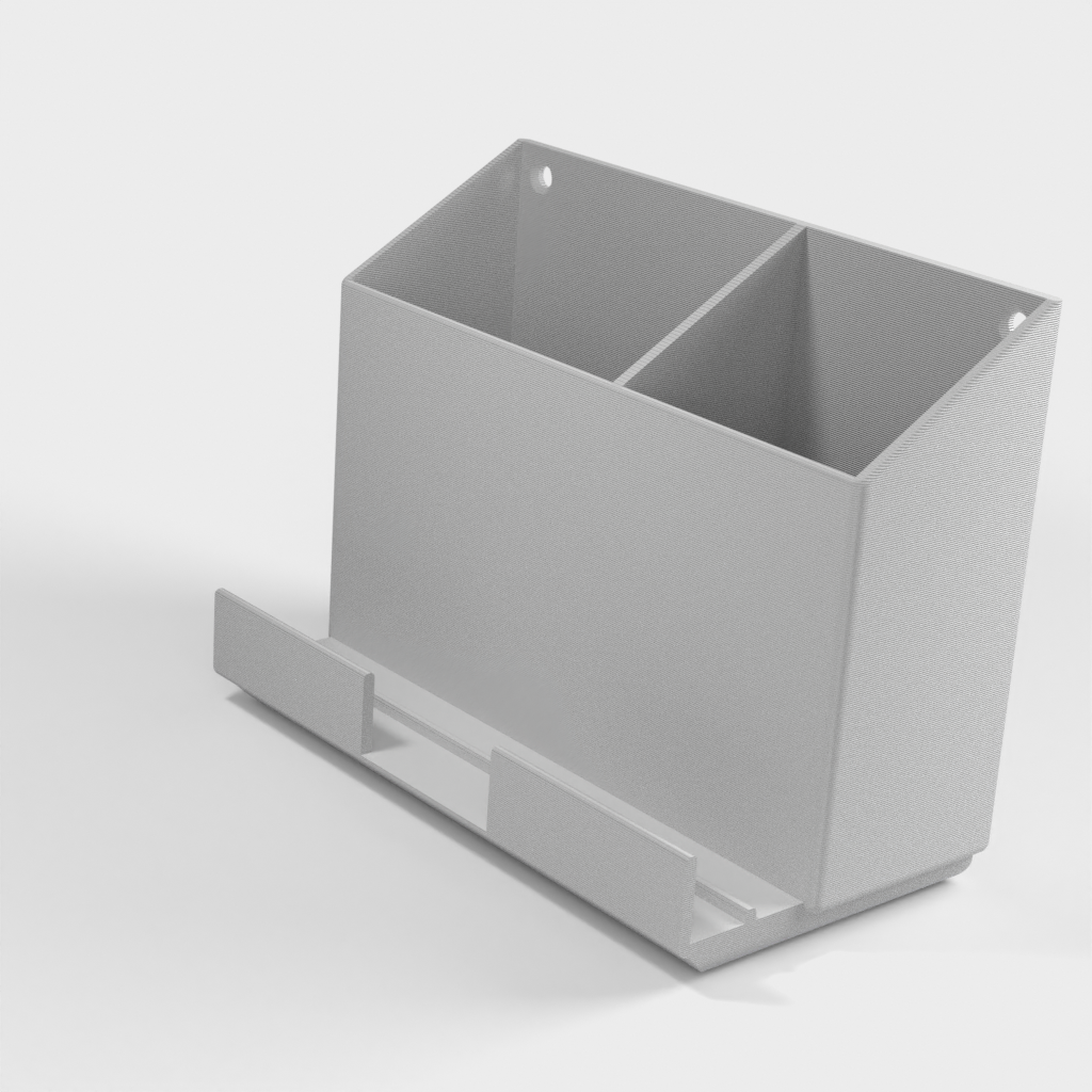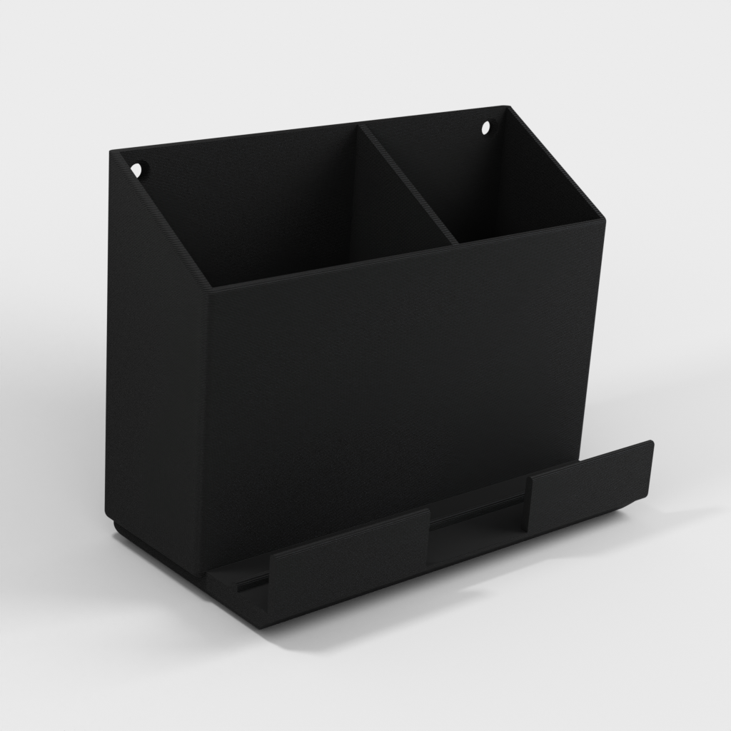 Naścienny uchwyt na pilota z miejscem na dwa piloty i telefon komórkowy. Większy uchwyt idealnie nadaje się do sterowników klimatyzacji, a mniejszy doskonale sprawdza się w przypadku sterowników telewizyjnych. Produkt oferuje również poręczny uchwyt z przodu na telefon. Ponadto ten produkt zawiera plik Freecad, dzięki czemu można łatwo zmienić położenie linii podziału lub całkowicie ją usunąć.