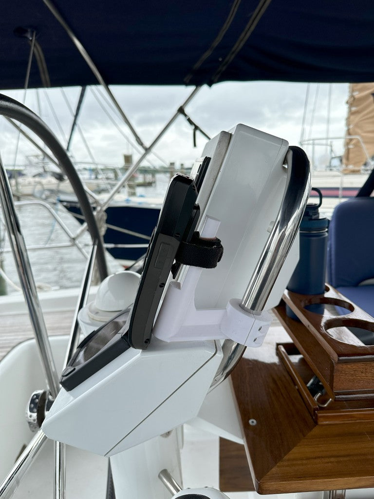 Uchwyt jest zoptymalizowany do użytku na zewnątrz i chociaż można go wyprodukować z PLA, zalecany jest PETG dla lepszej odporności na promieniowanie UV i dłuższej trwałości w warunkach morskich. Przemyślana konstrukcja obejmuje lekko podwyższone dolne podparcie, dzięki czemu czyszczenie pod uchwytem jest bezproblemowe. Uchwyt mocuje się do relingu, wiercąc otwory i mocując go za pomocą śrub ze stali nierdzewnej, co zapewnia stabilną i niezawodną instalację.