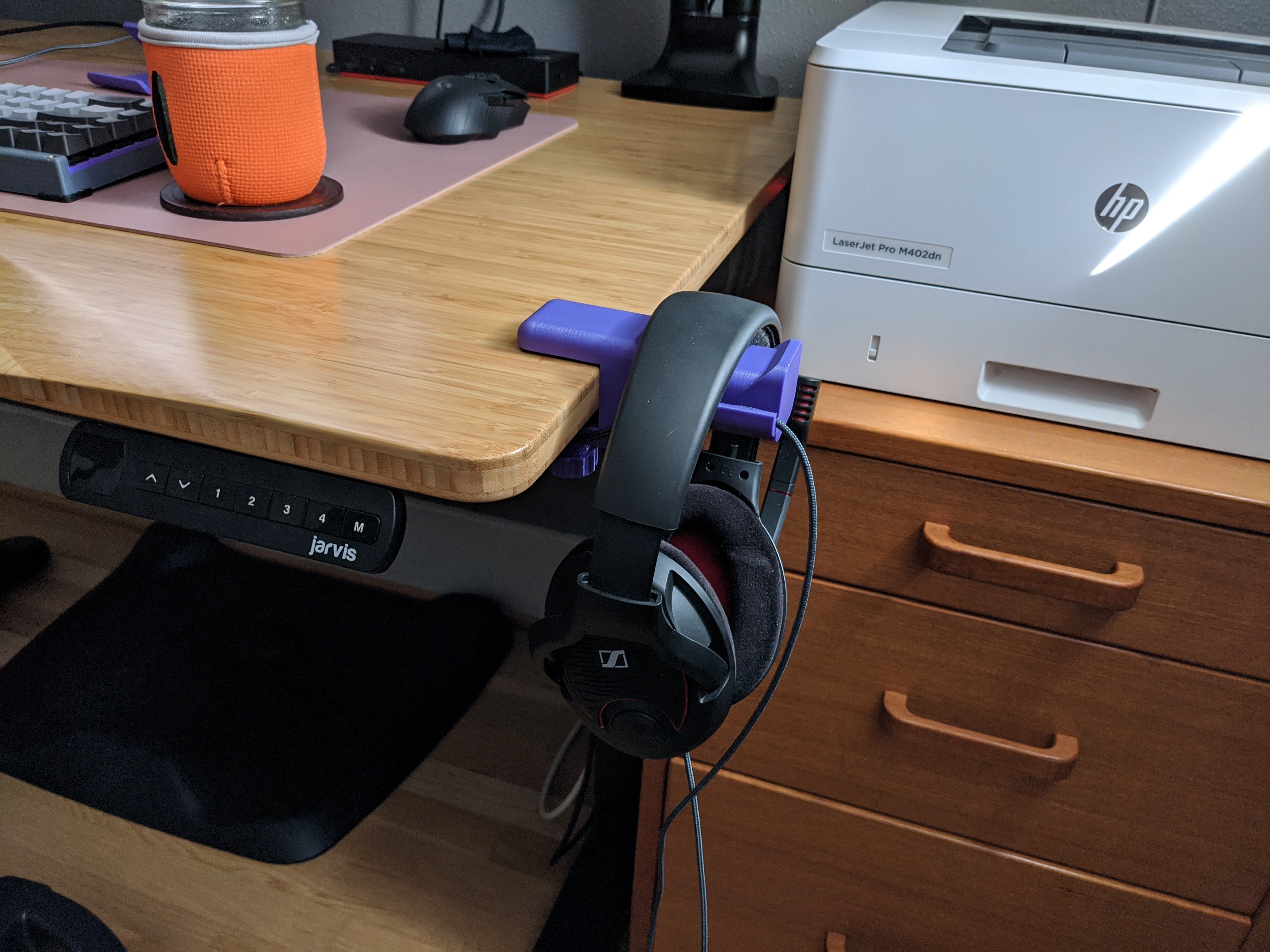 Jest to wieszak na słuchawki, który można zamontować na biurku. Można go parametrycznie dostosować za pomocą Fusion 360 do własnych potrzeb. Po wydrukowaniu najlepiej jest zamontować coś z uchwytami na powierzchniach stykających się z biurkiem. Zapewni to, że wieszak pozostanie mocno przymocowany do biurka i nie będzie się przesuwał.