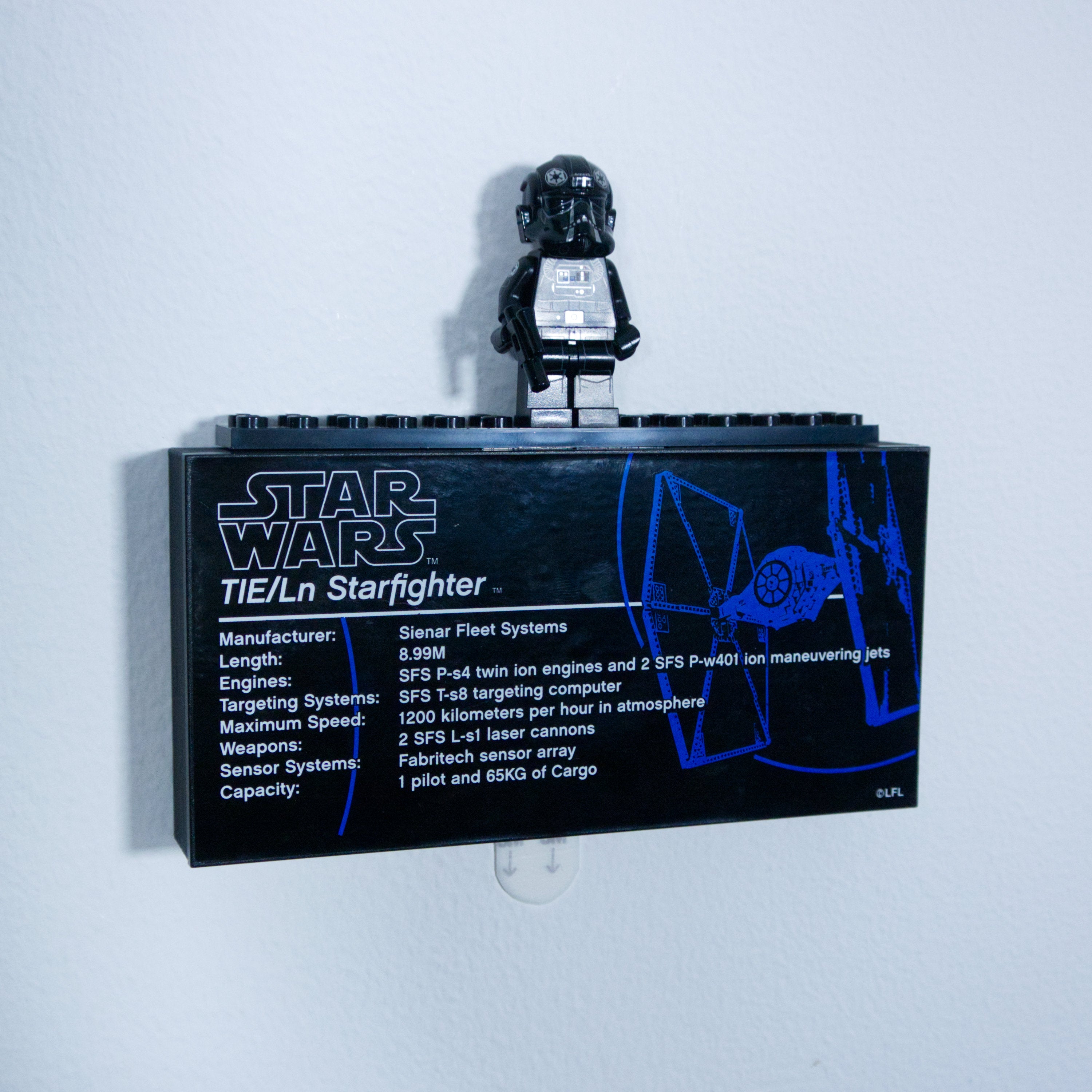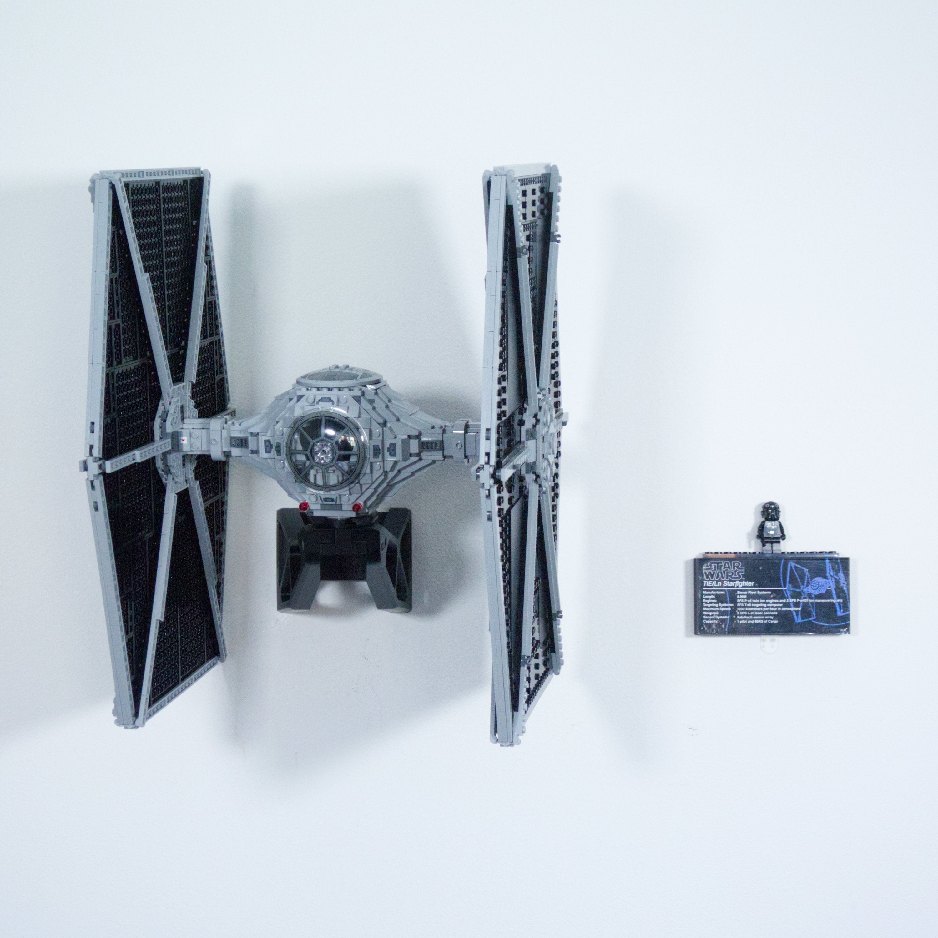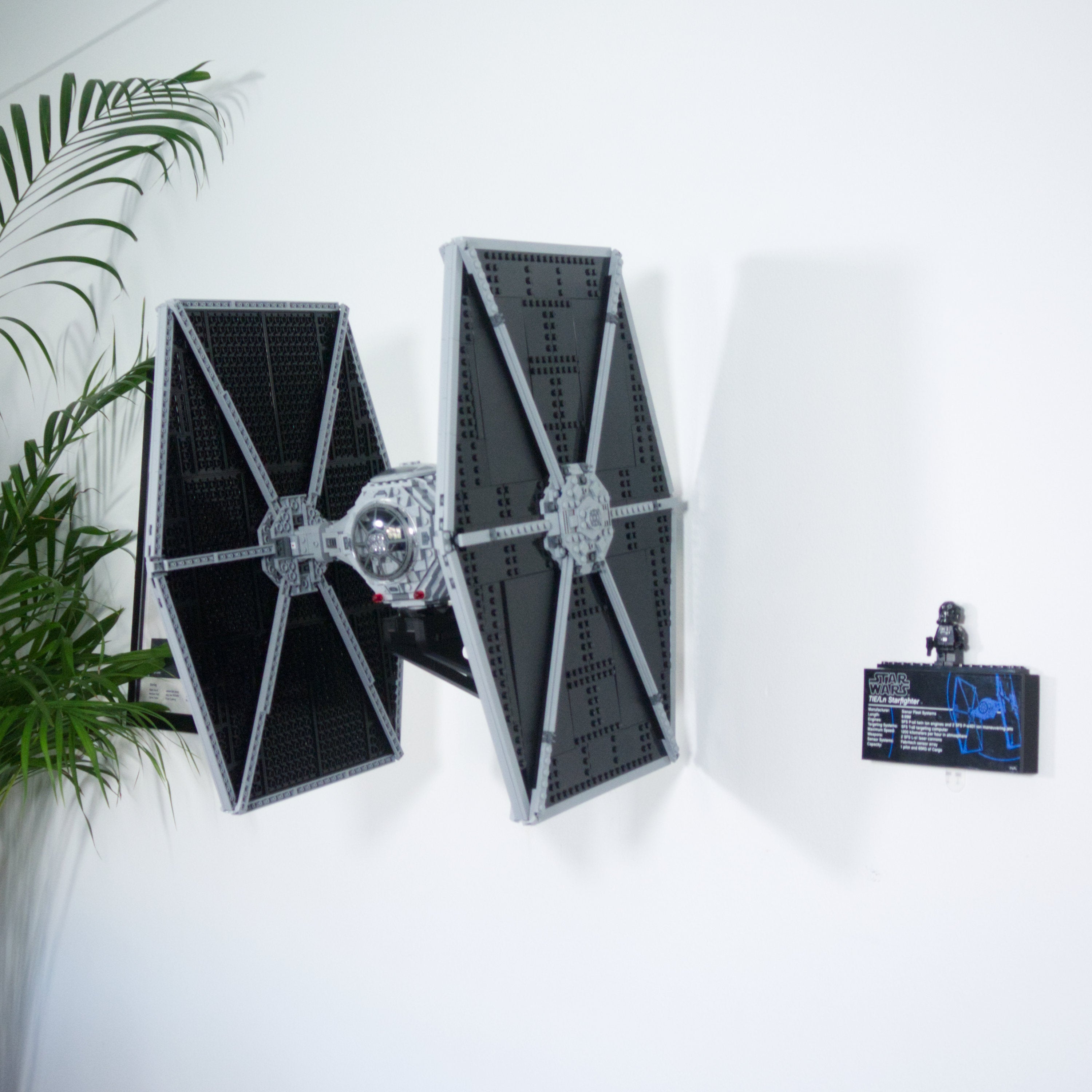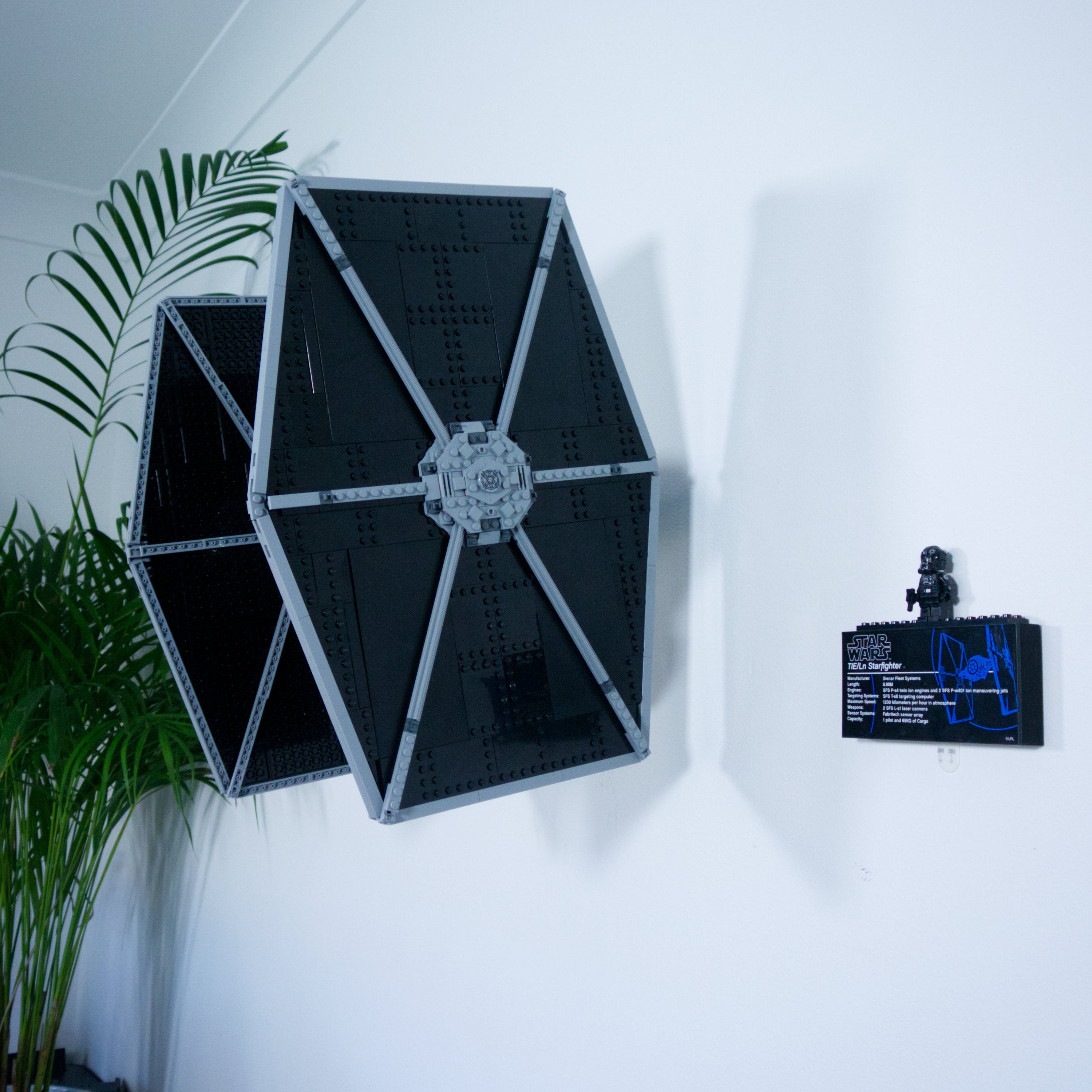 Ten uchwyt ścienny do Star Wars UCS Tie Fighter 75095 utrzymuje model odsunięty od ściany pod kątem 10 stopni w dół. Kąt można regulować o 15 stopni na boki lub ustawić prosto do przodu. Zestaw zawiera również mocowanie na tabliczkę informacyjną i minifigurki, co zapewnia kompletny eksponat.