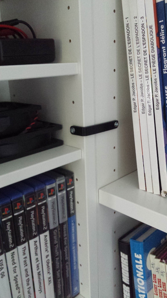 Ten wspornik jest przeznaczony do przechowywania dwóch półek na książki IKEA BILLY ( http://www.ikea.com/fr/fr/catalog/products/30323353/ ) i jednej półki IKEA GNEDBY ( http://www.ikea.com/fr / fr/catalog/products/00323364/ ) pod kątem. To rozwiązanie pozwala uniknąć elastyczności i szczelin pomiędzy półkami i wymaga jedynie oryginalnego mocowania półek i 2 małych śrubek do montażu wspornika.